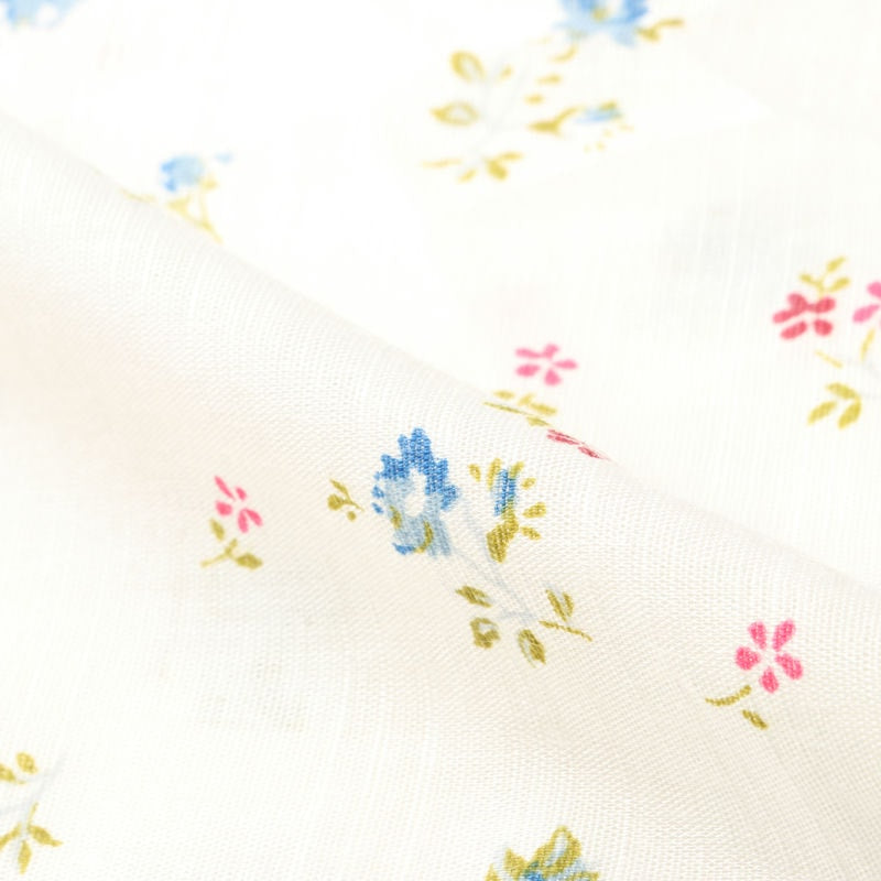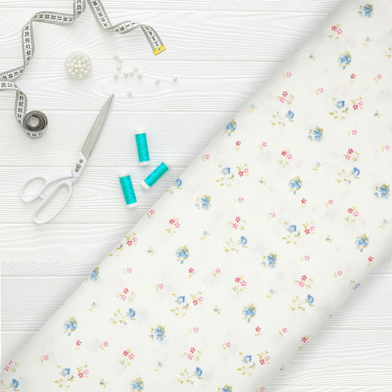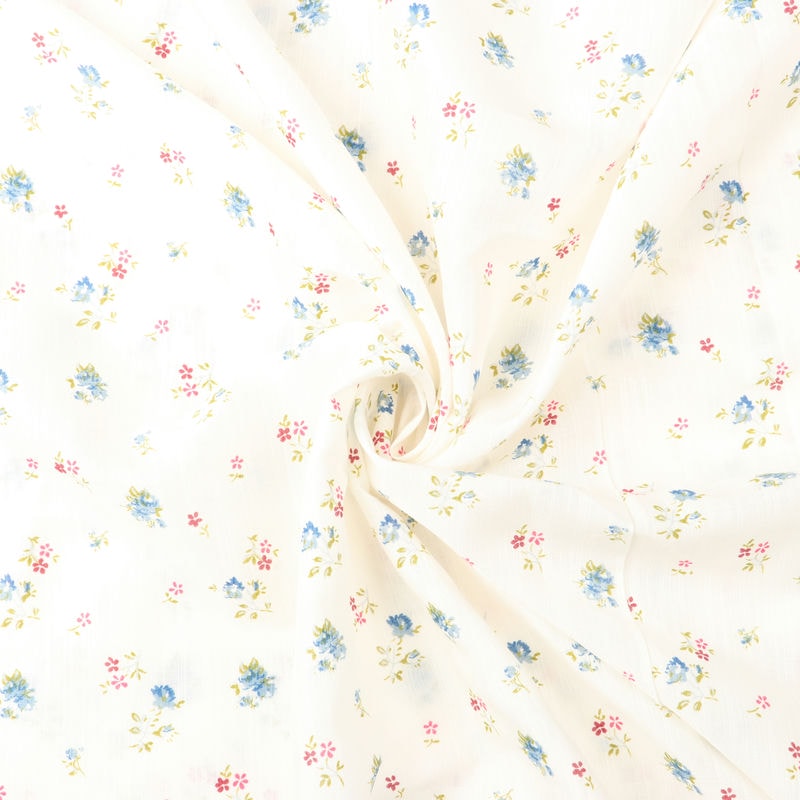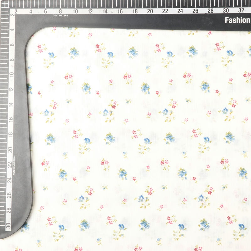 White And Blue Floral Pattern Screen Print Cotton Fabric