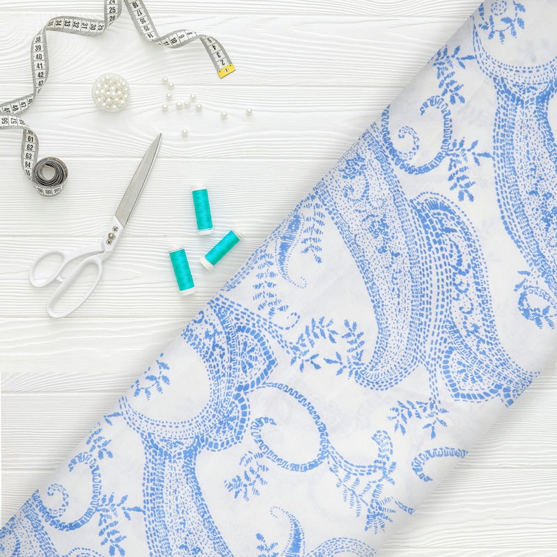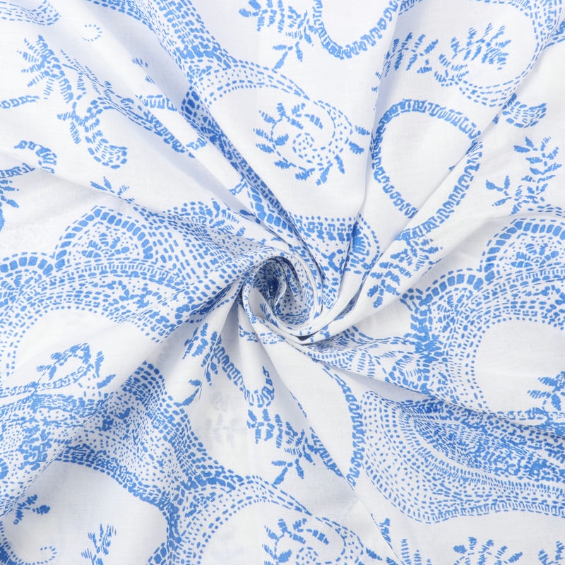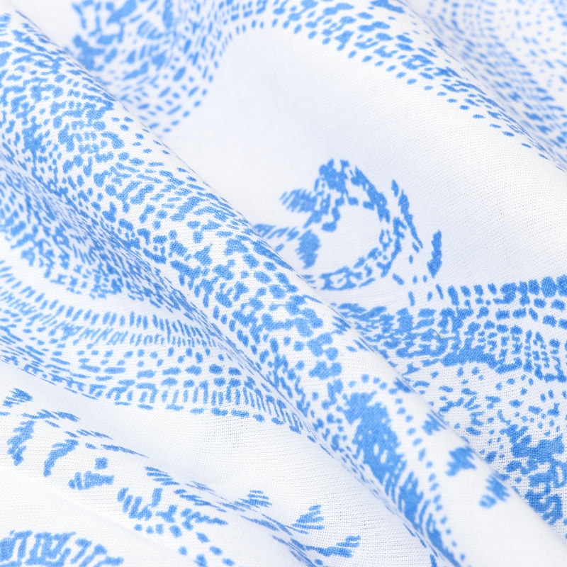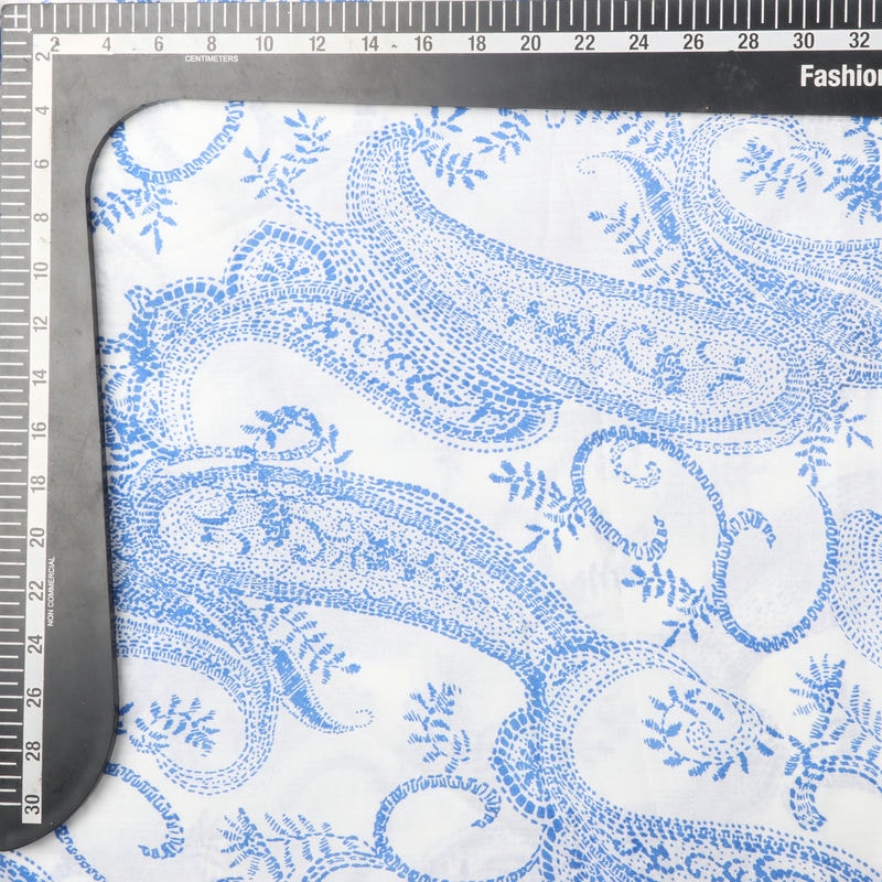 White And Blue Paisley Pattern Screen Print Cambric Cotton Fabric