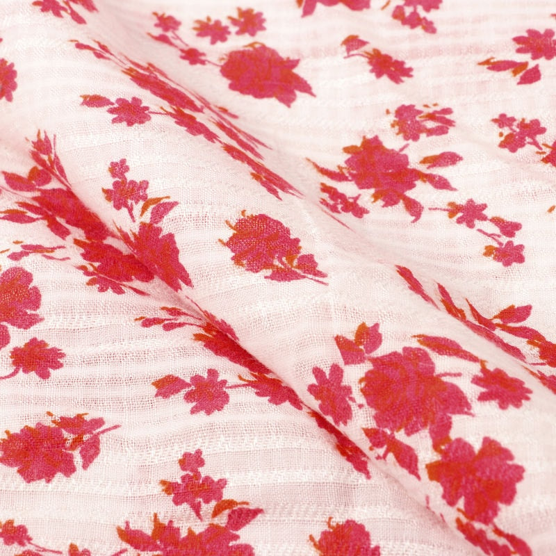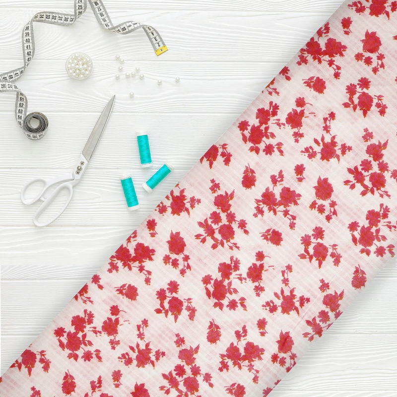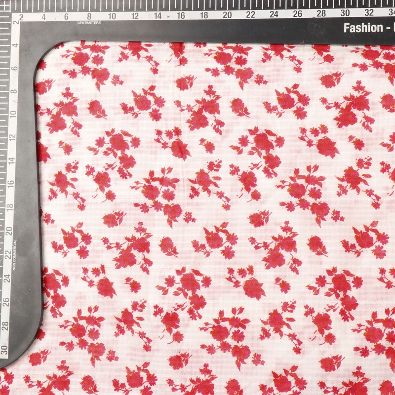 White And Red Floral Pattern Screen Print Cambric Dobby Fabric