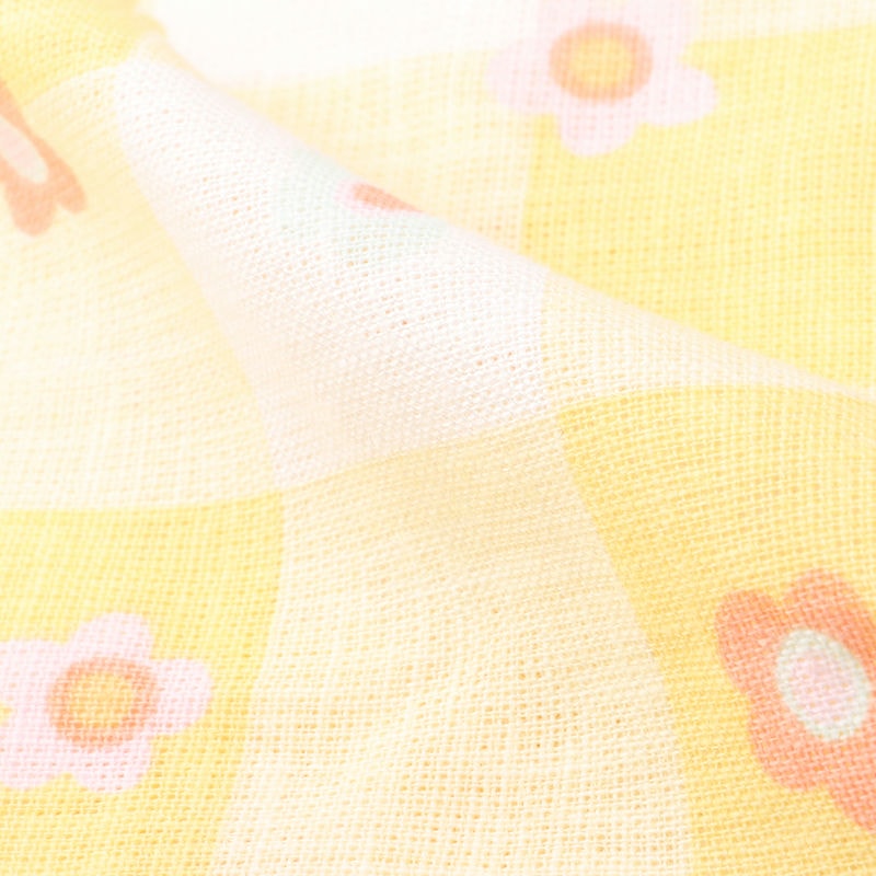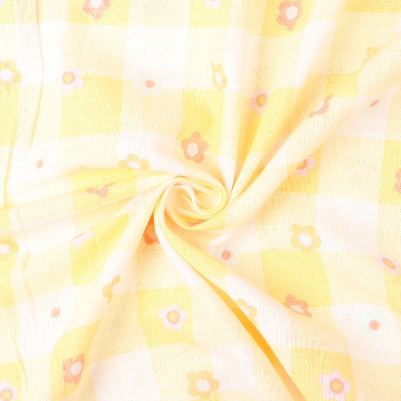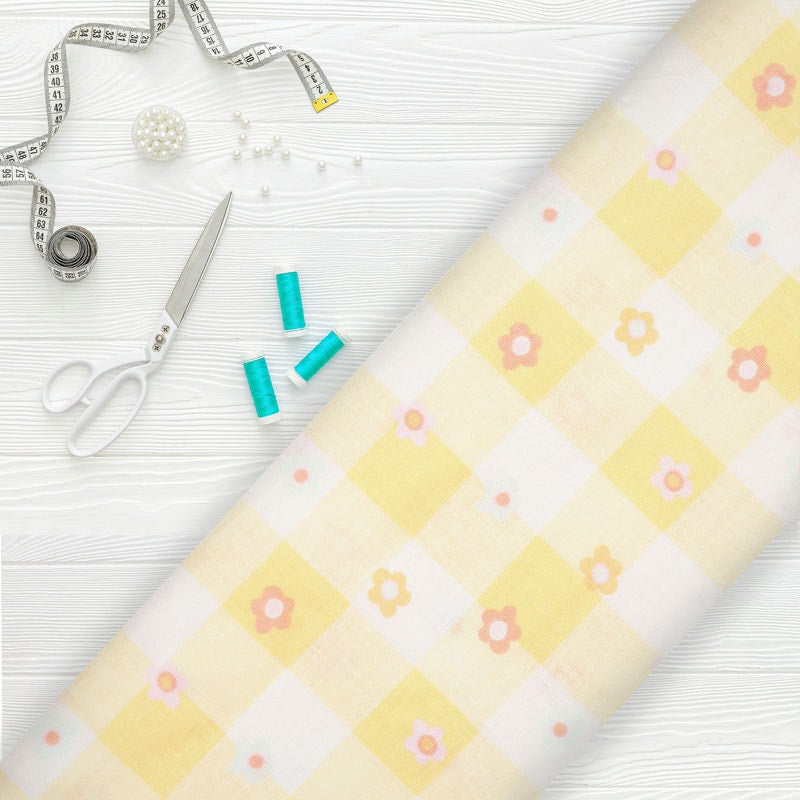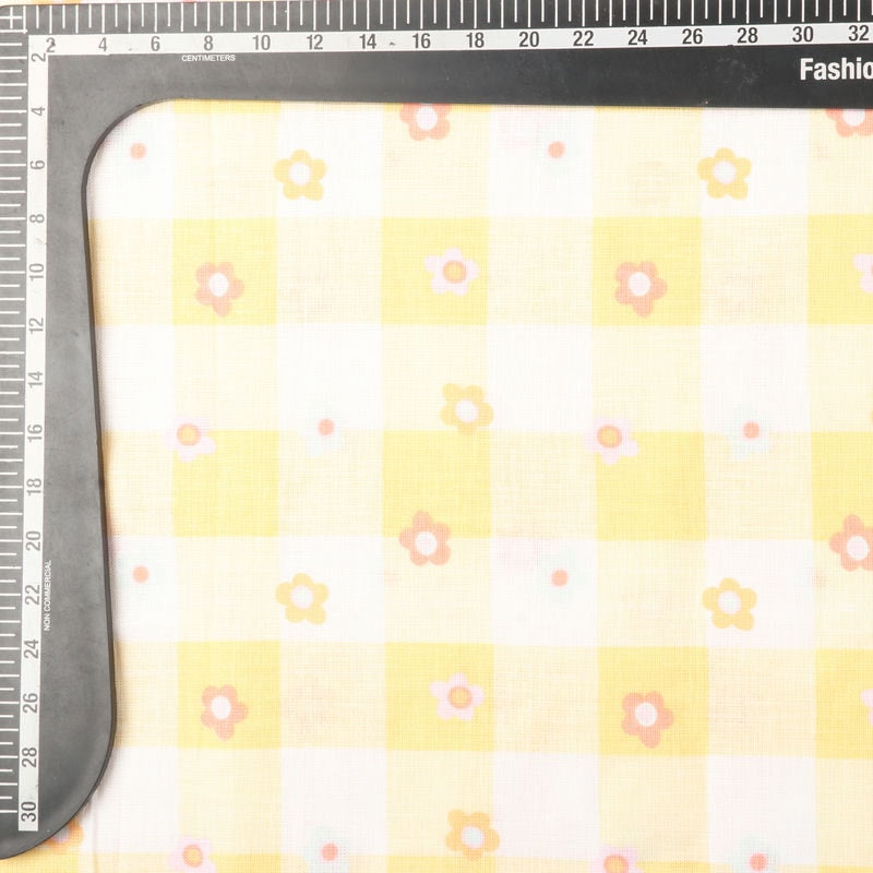 White And Yellow Checks Pattern Screen Print Cotton Flax Fabric