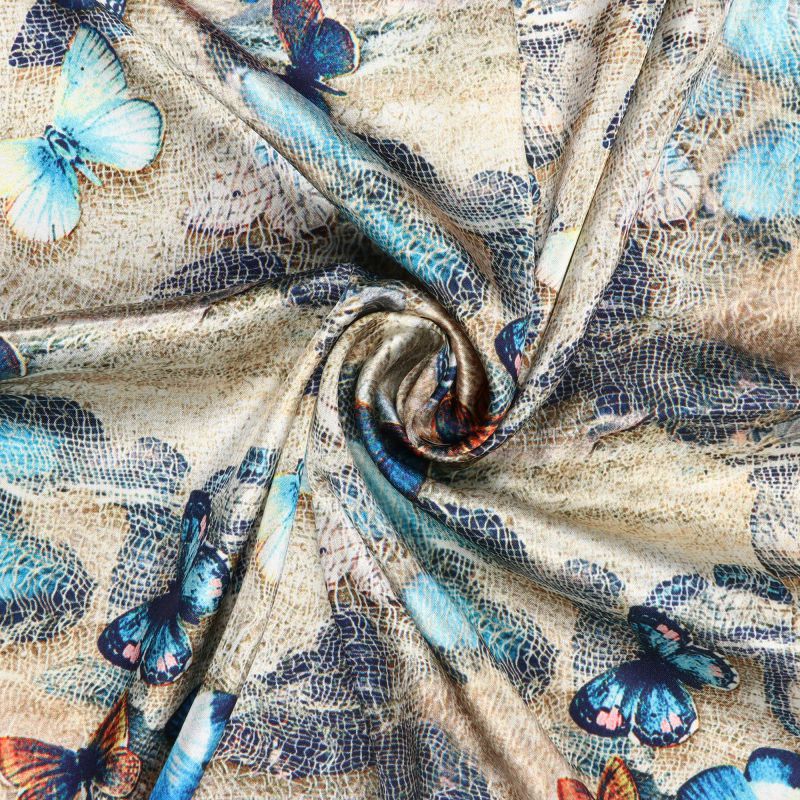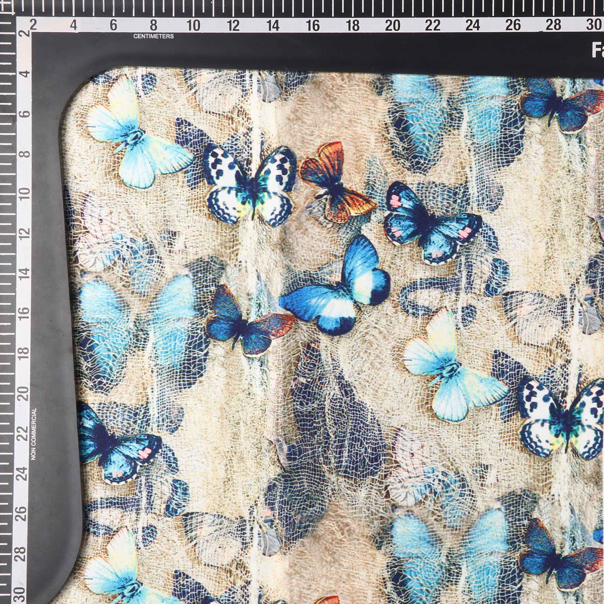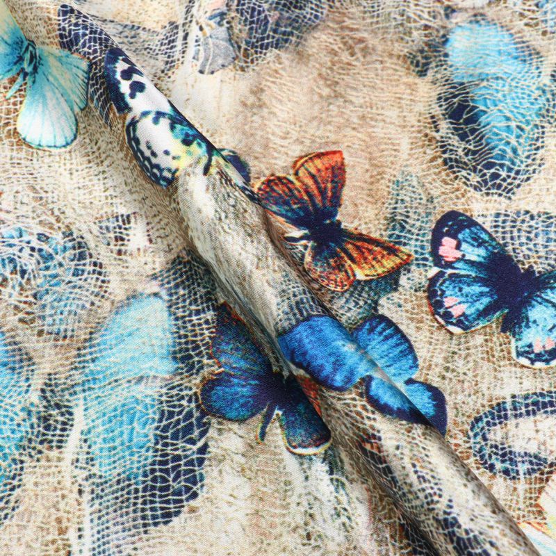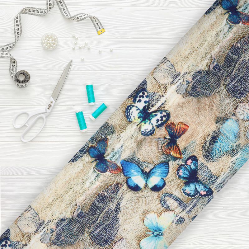 Cream And Blue Butterfly Pattern Digital Print Crepe Fabric