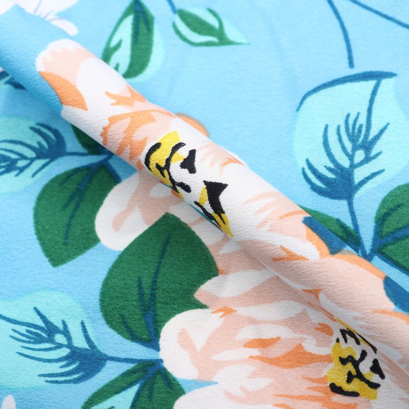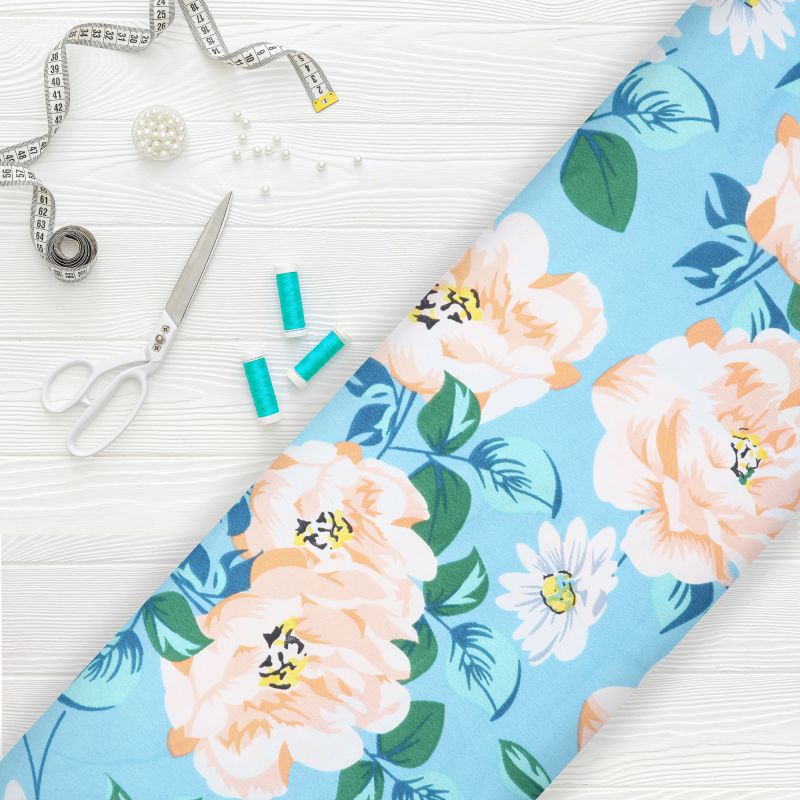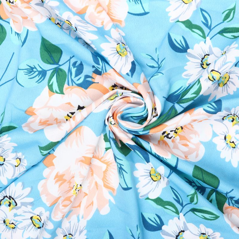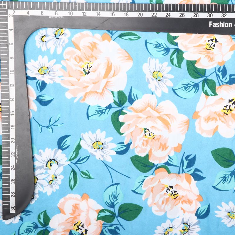 Sky Blue And White Floral Pattern Screen Print Micro Crepe Fabric