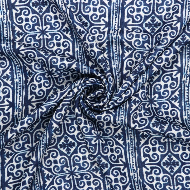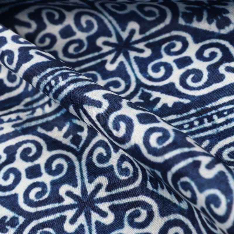 Blue And White Ethnic Pattern Digital Print Crepe Satin Fabric