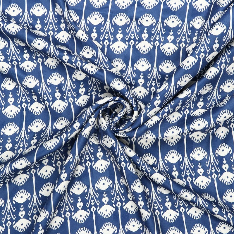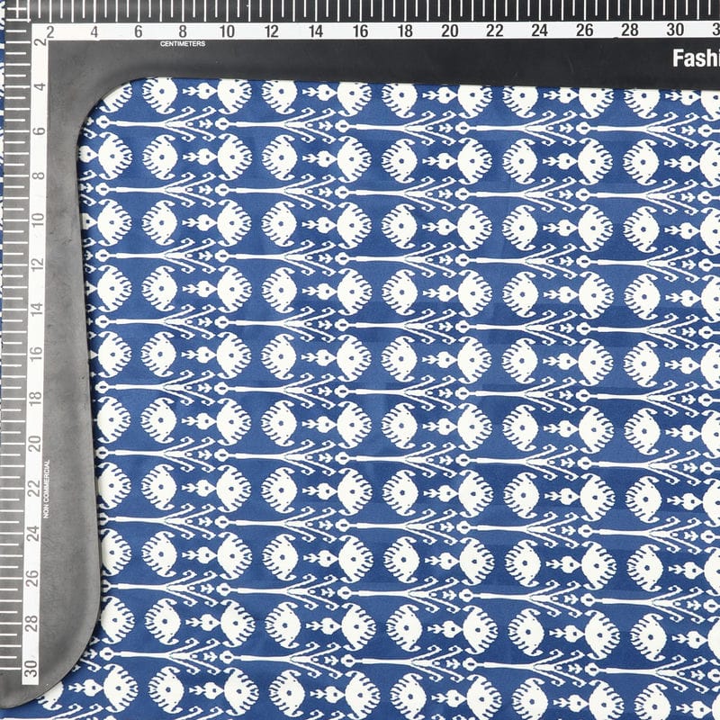 Navy Blue And White Ethnic Pattern Digital Print Crepe Satin Fabric