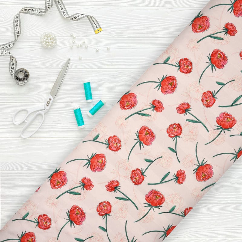 Peach And Red Floral Pattern Digital Print Crepe Satin Fabric