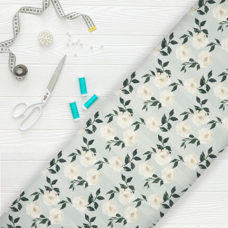 Pista Green And White Floral Pattern Digital Print Crepe Satin Fabric