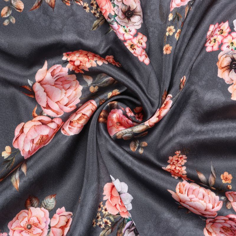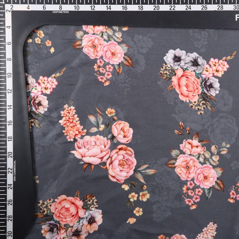 Dark Grey And Pink Floral Pattern Digital Print Japan Satin Fabric