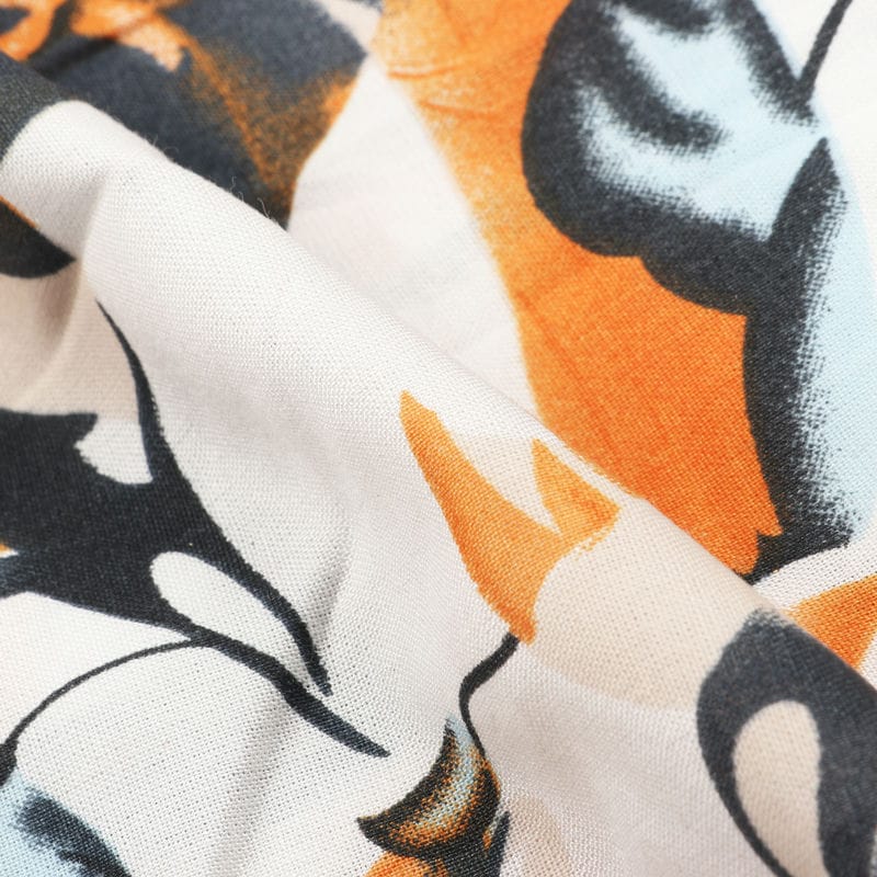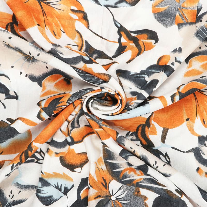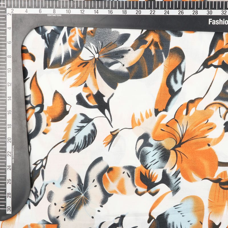 White And Orange Floral Pattern Screen Print Cotton Fabric