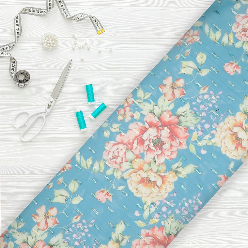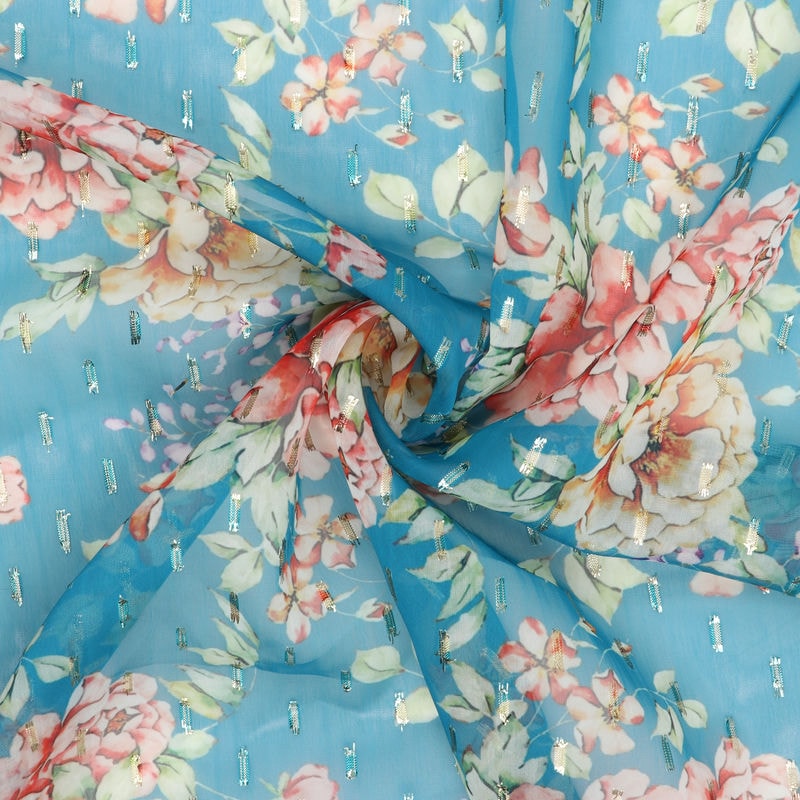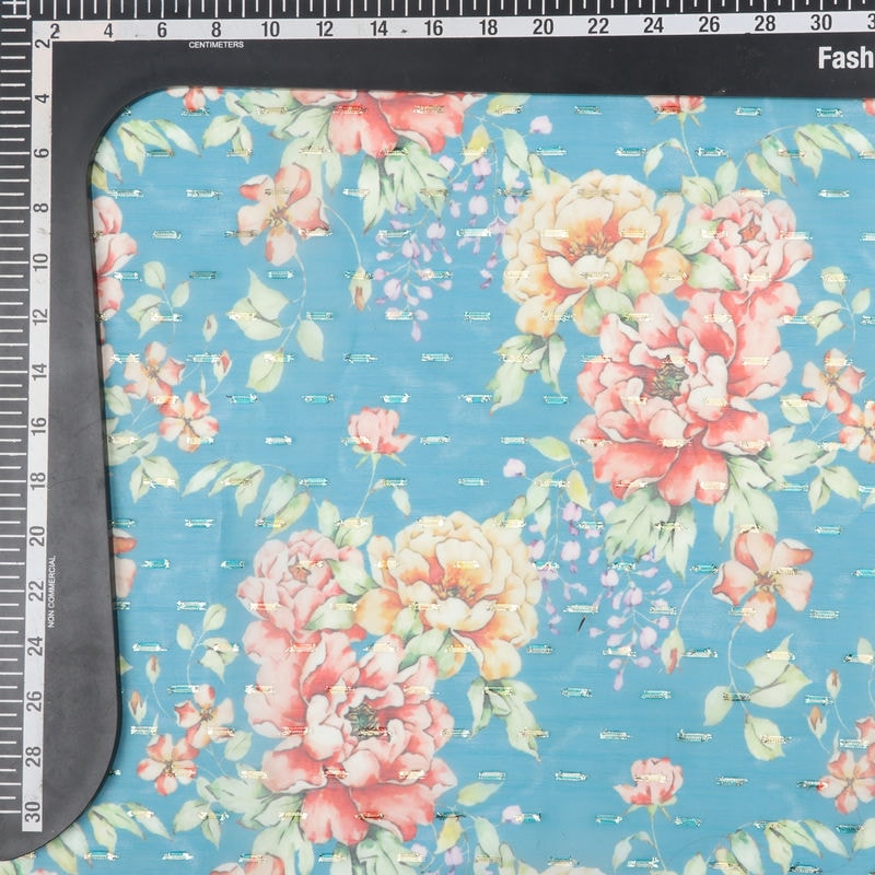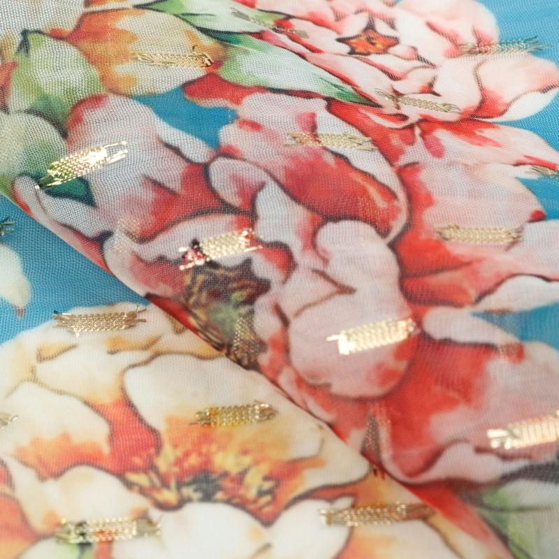 Blue And Peach Floral Pattern Digital Print Chiffon Golden Dobby Fabric