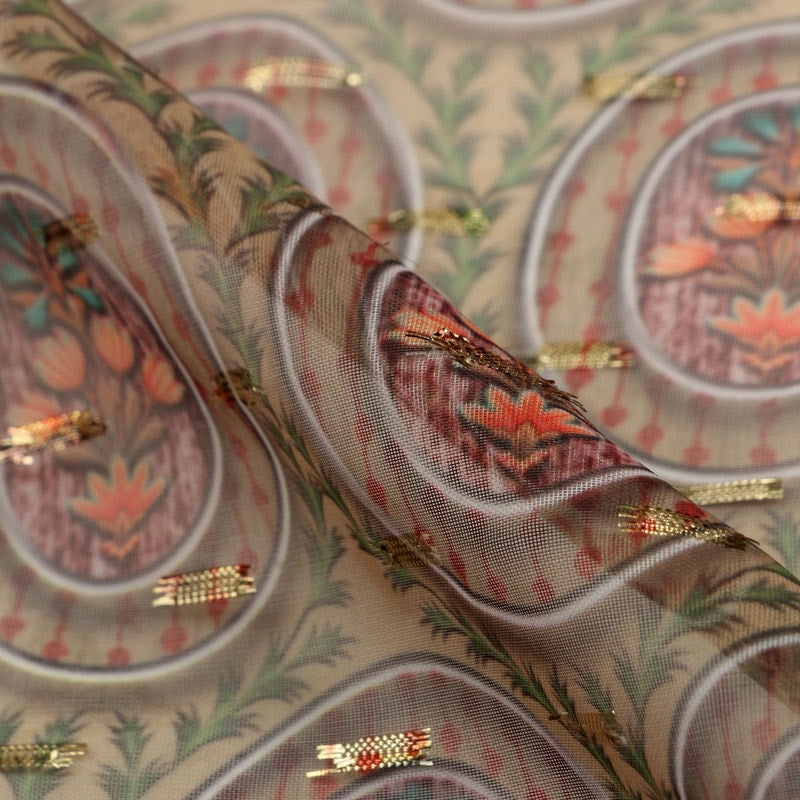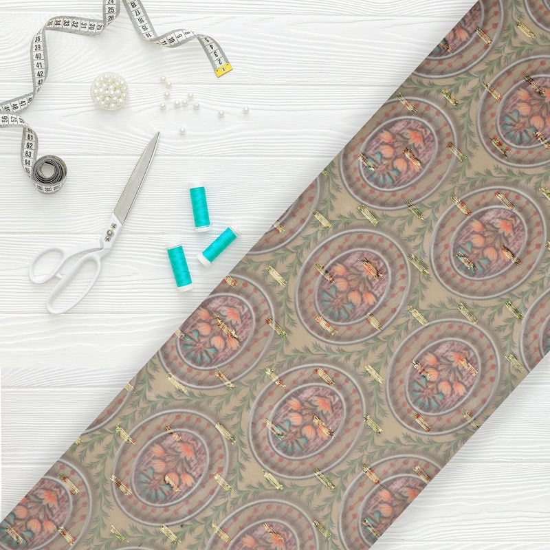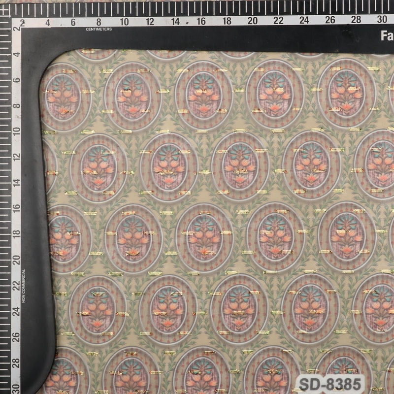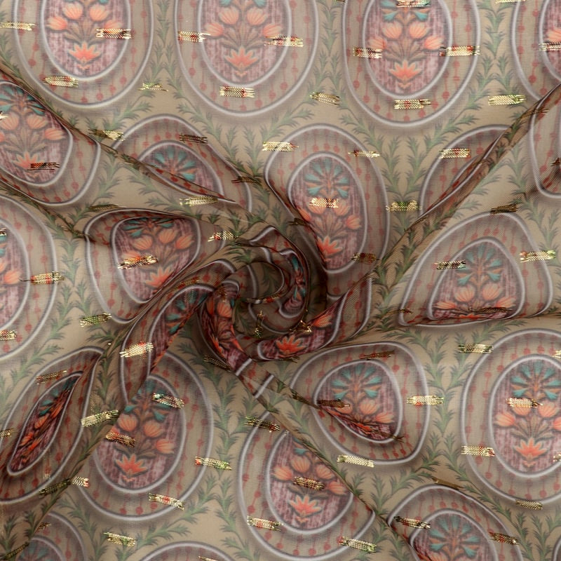 Green And Peach Floral Pattern Digital Print Chiffon With Golden Zari Dobby Fabric