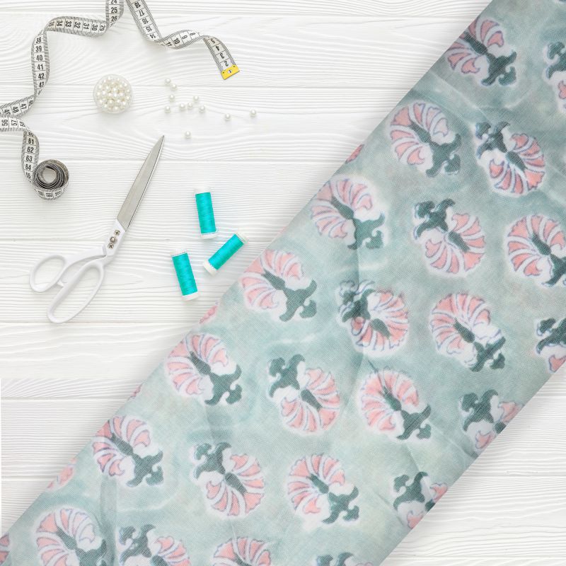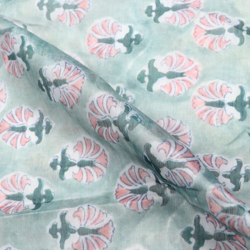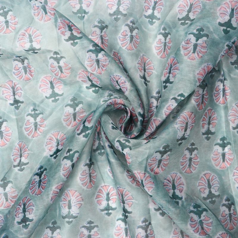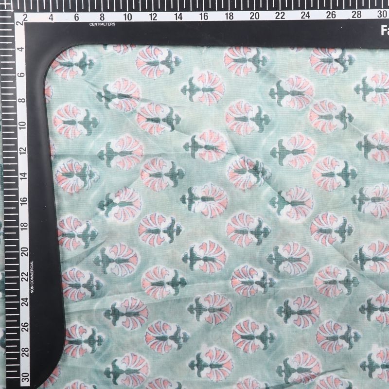 Mint Green And Peach Floral Pattern Digital Print Chanderi Fabric