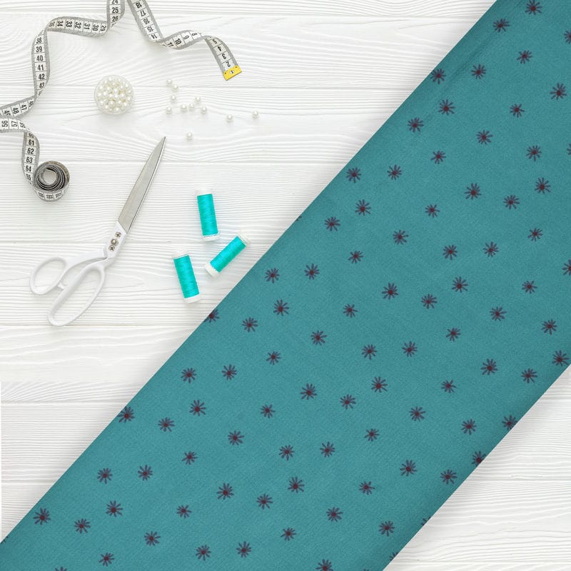 Ocen Blue And Black Floral Pattern Screen Print Cotton Satin Fabric