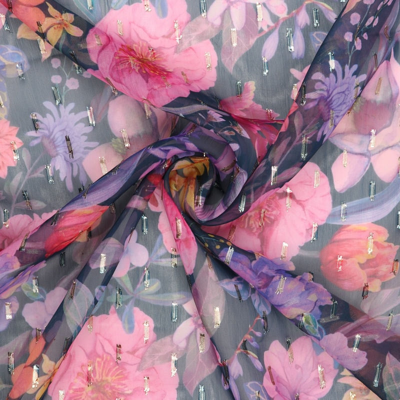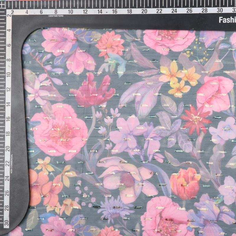 Pink And Lavender Floral Pattern Digital Print Chiffon Golden Dobby Fabric