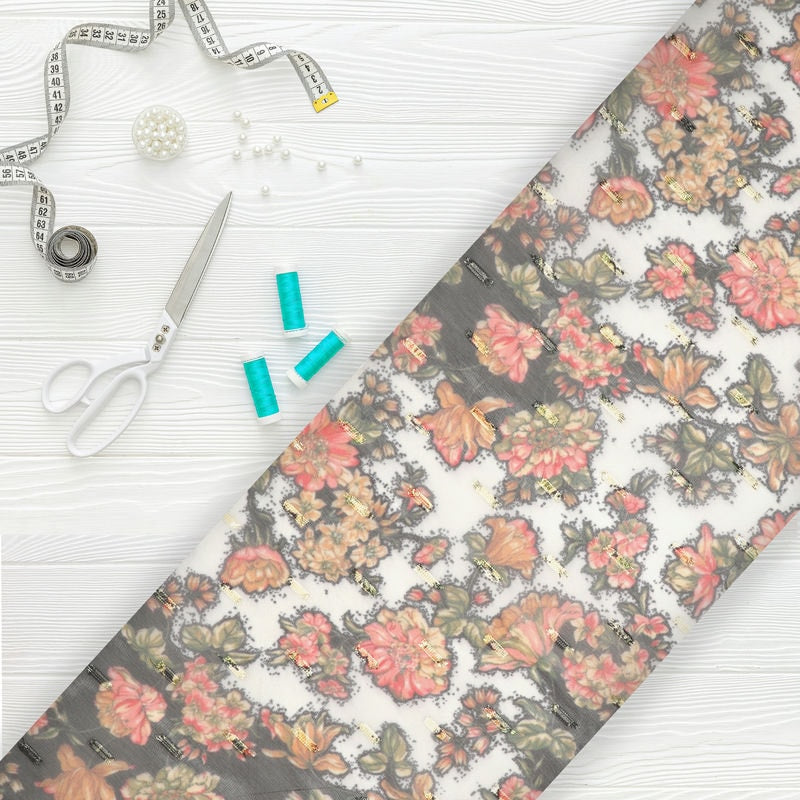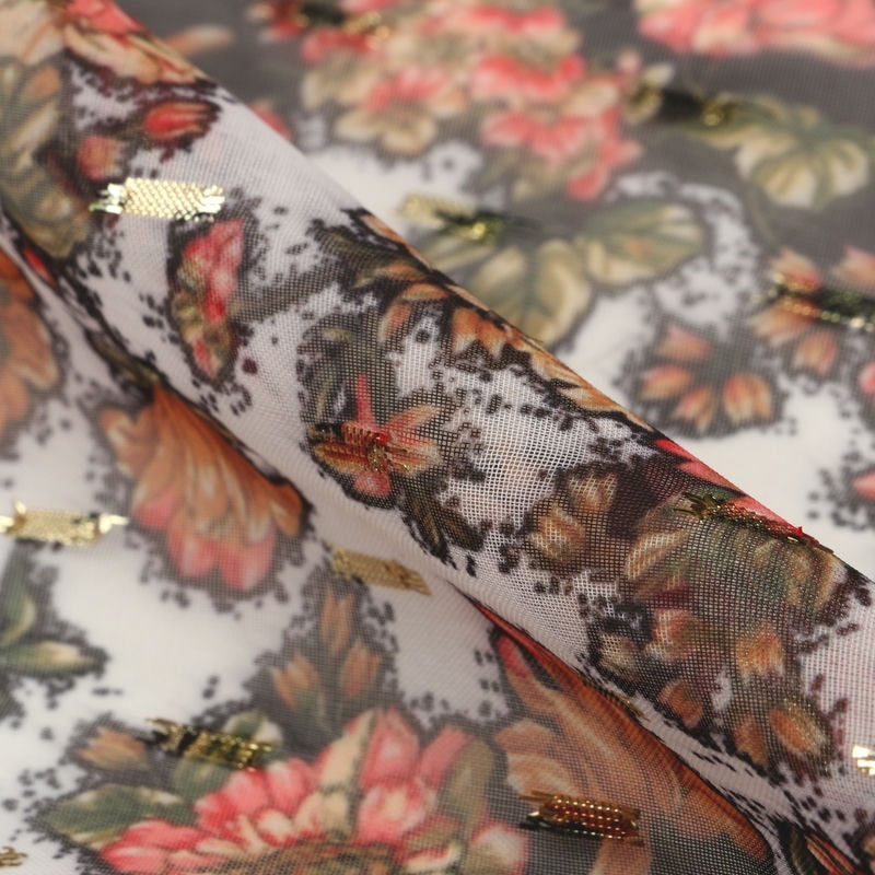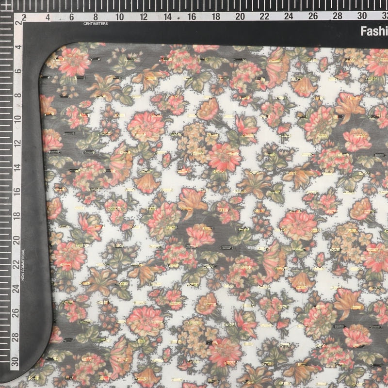 Pinkis Red And Black Floral Pattern Digital Print Chiffon With Golden Zari Dobby Fabric