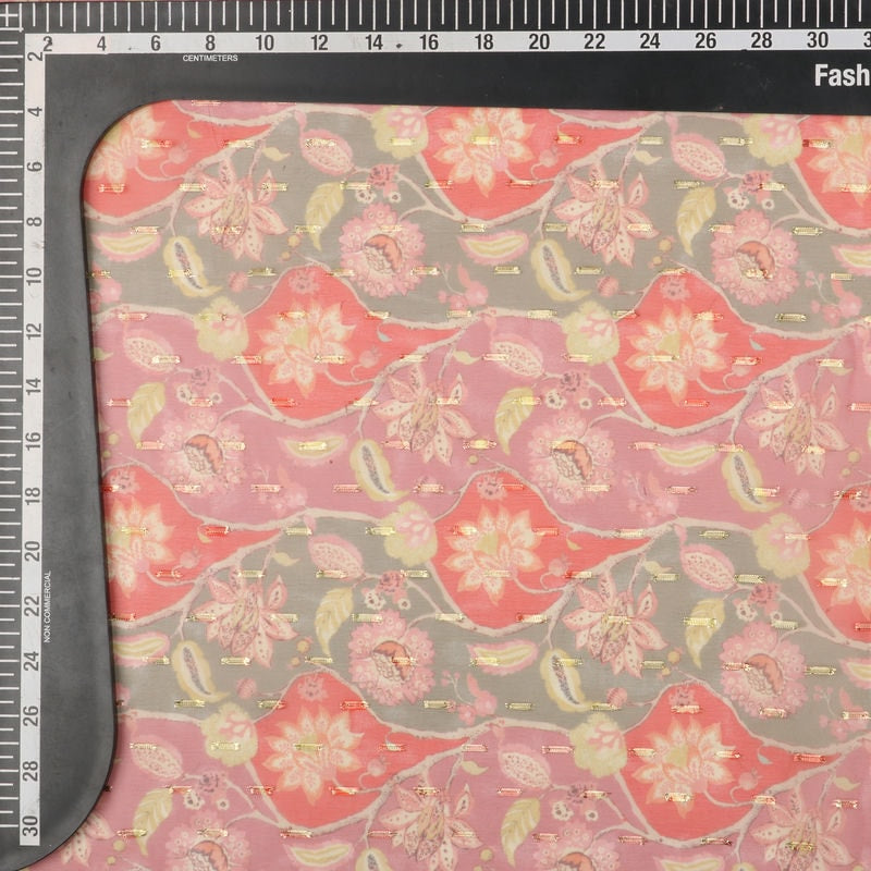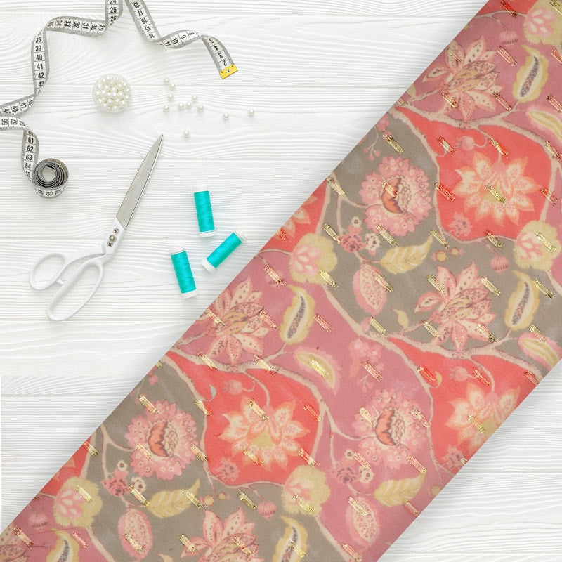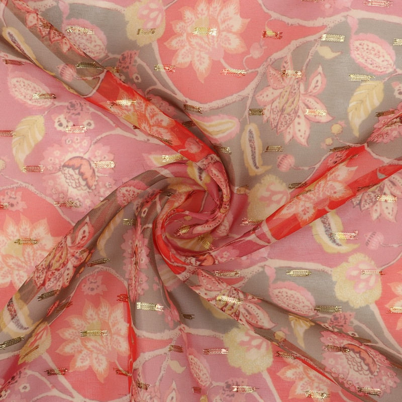Red And Pink Floral Pattern Digital Print Chiffon With Golden Zari Dobby Fabric