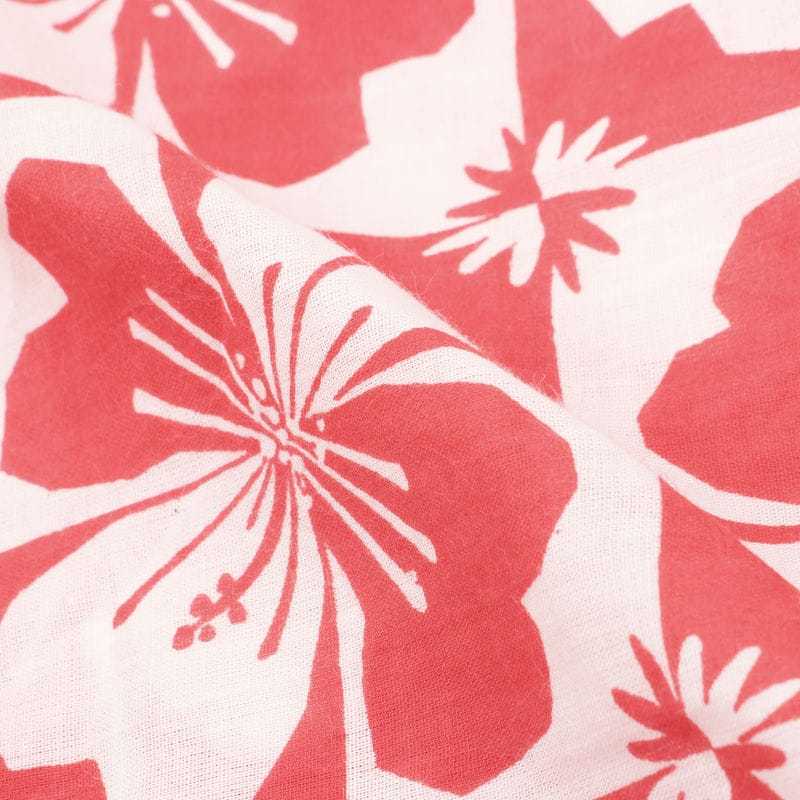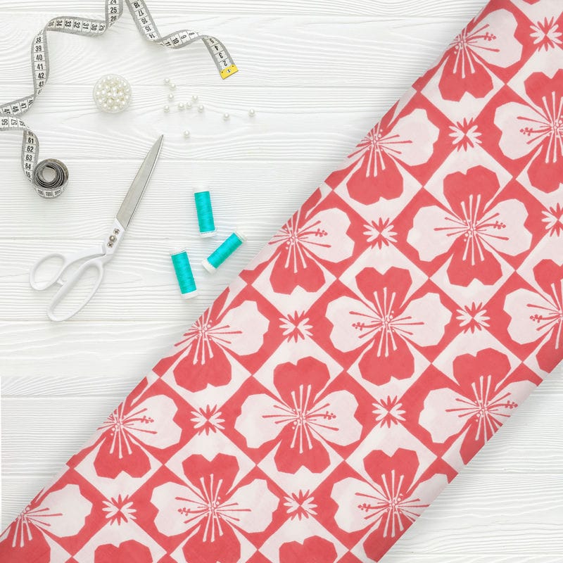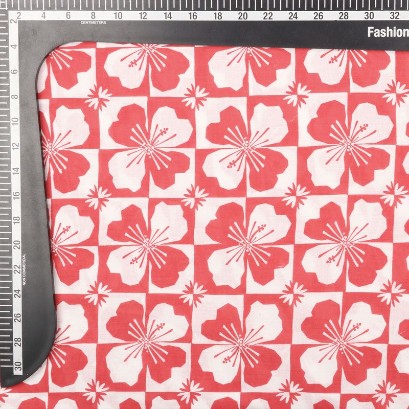 Red And White Floral Pattern Screen Print Cotton Fabric