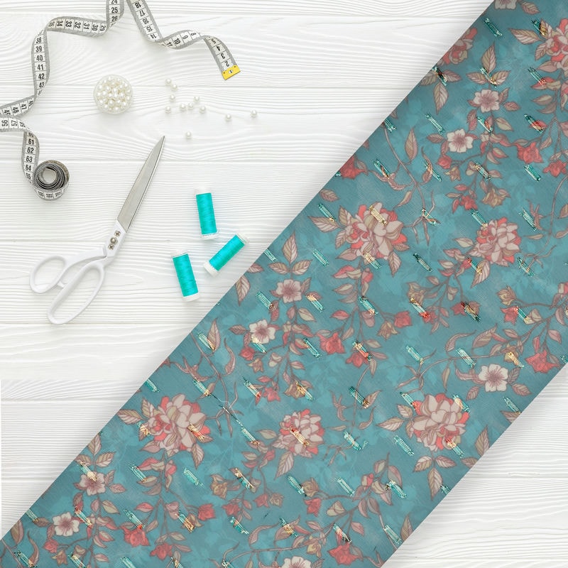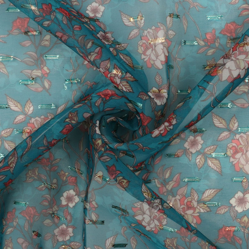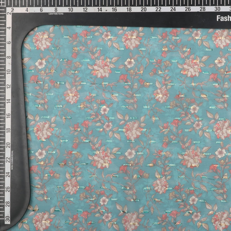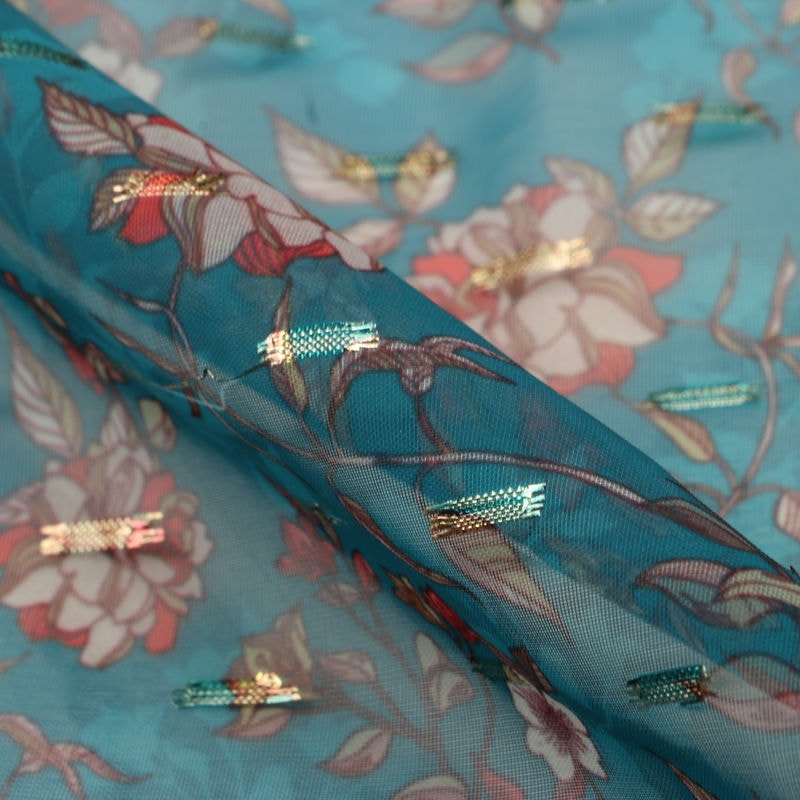 Sea Blue And White Floral Pattern Digital Print Chiffon With Golden Zari Dobby Fabric