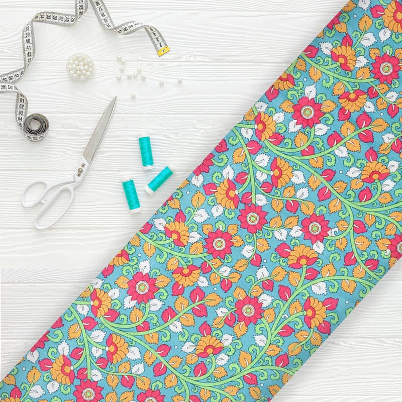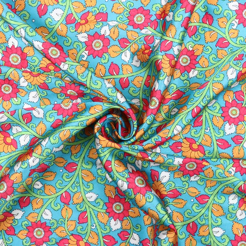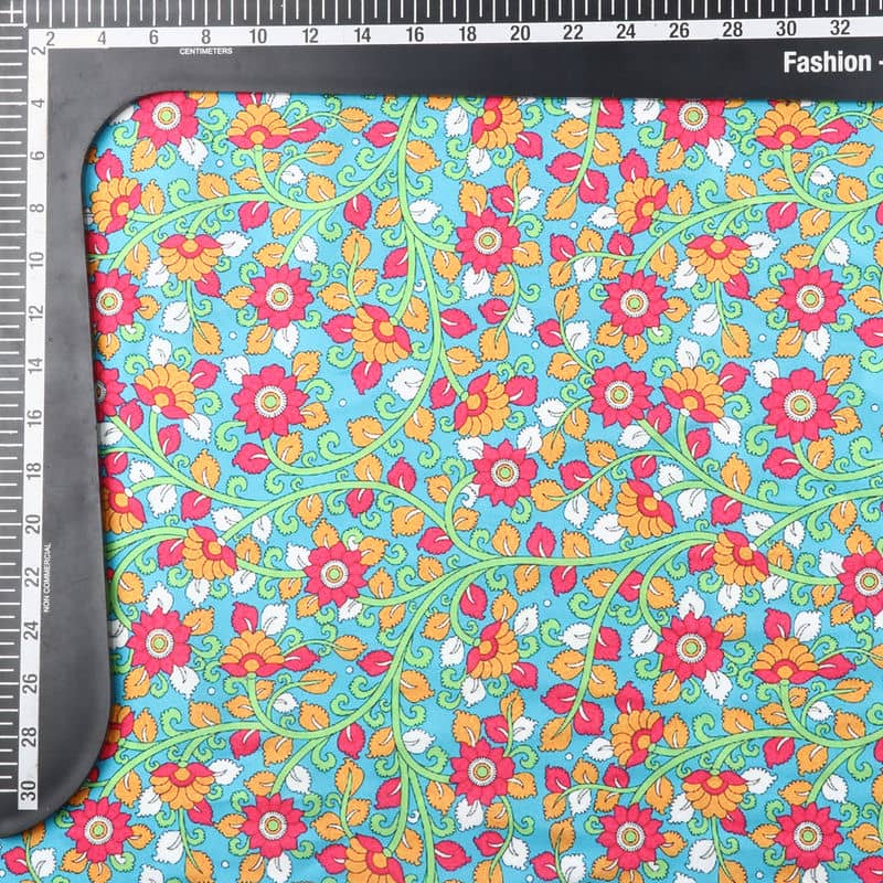 Turquoise And Dark Pink Floral Pattern Digital Print Japan Satin Fabric