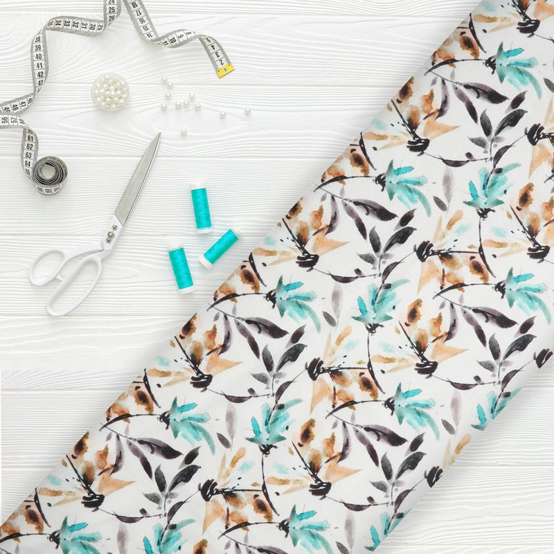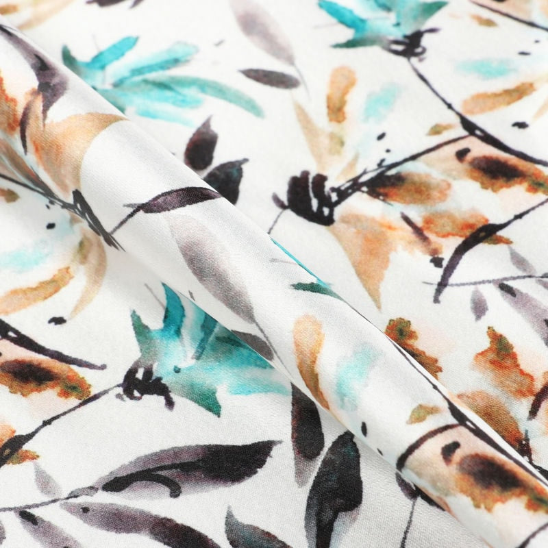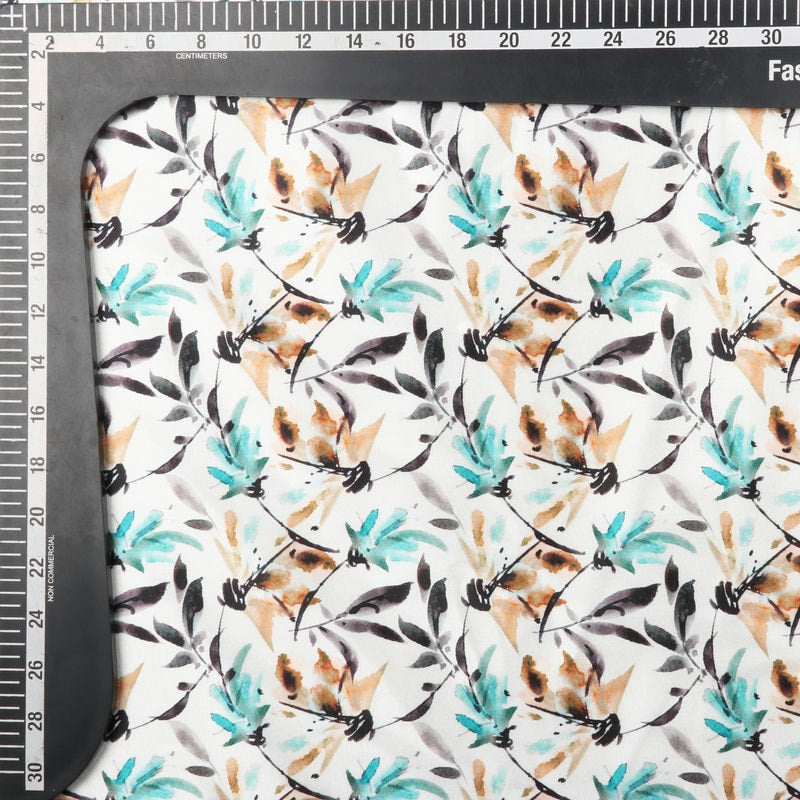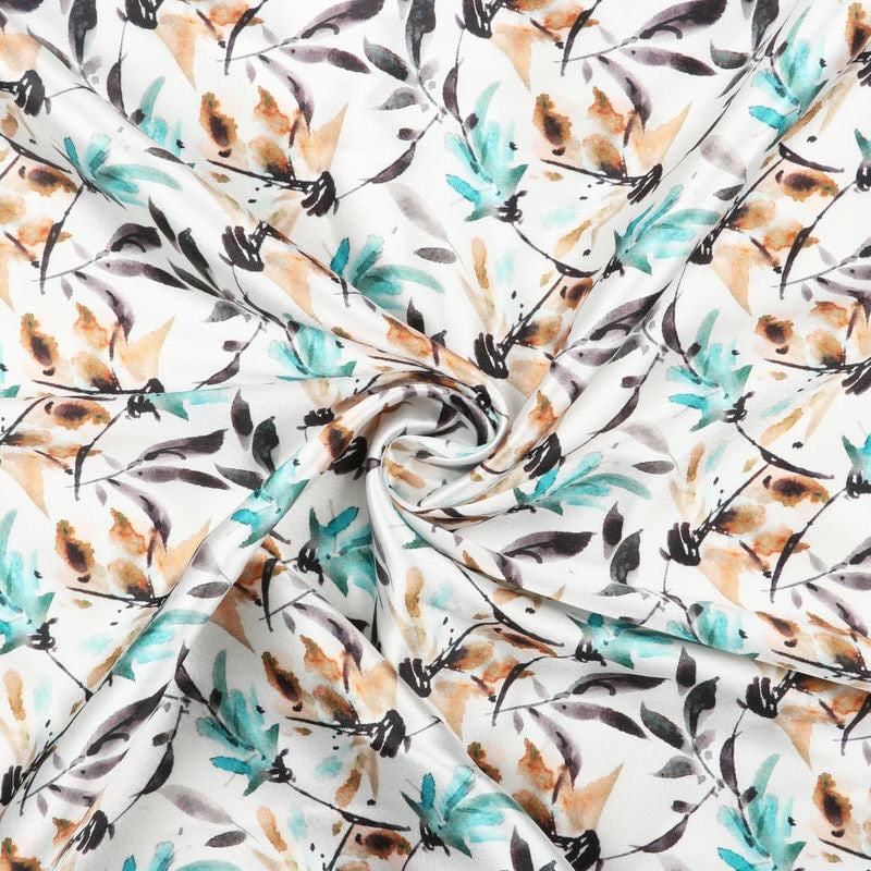 Turquoise And Light Brown Floral Pattern Digital Print Japan Satin Fabric