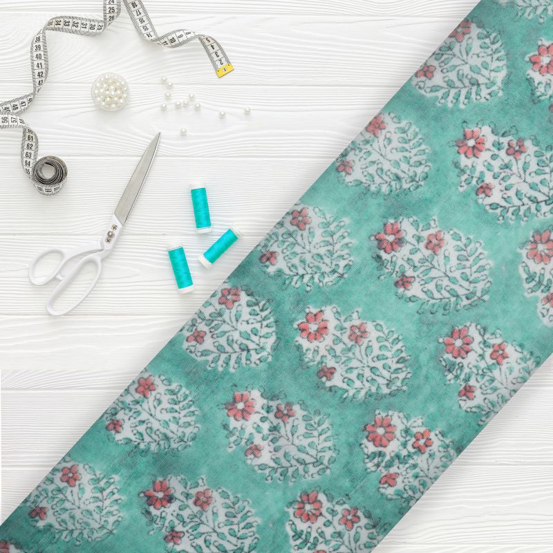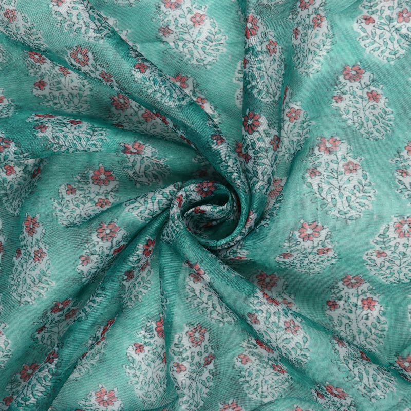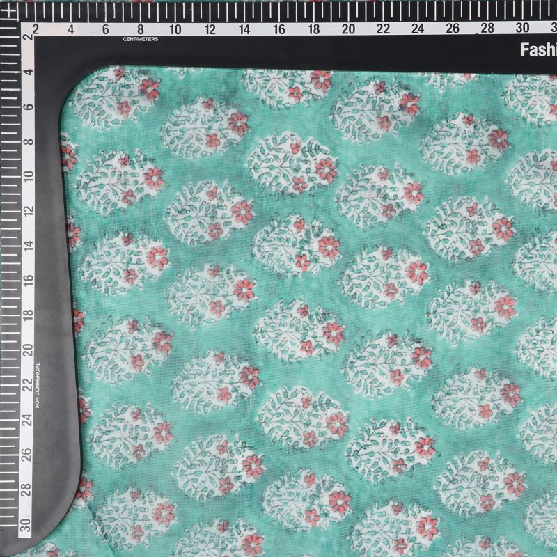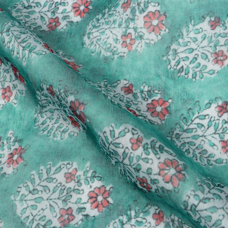 Turquoise Green And Red Floral Pattern Digital Print Chanderi Fabric