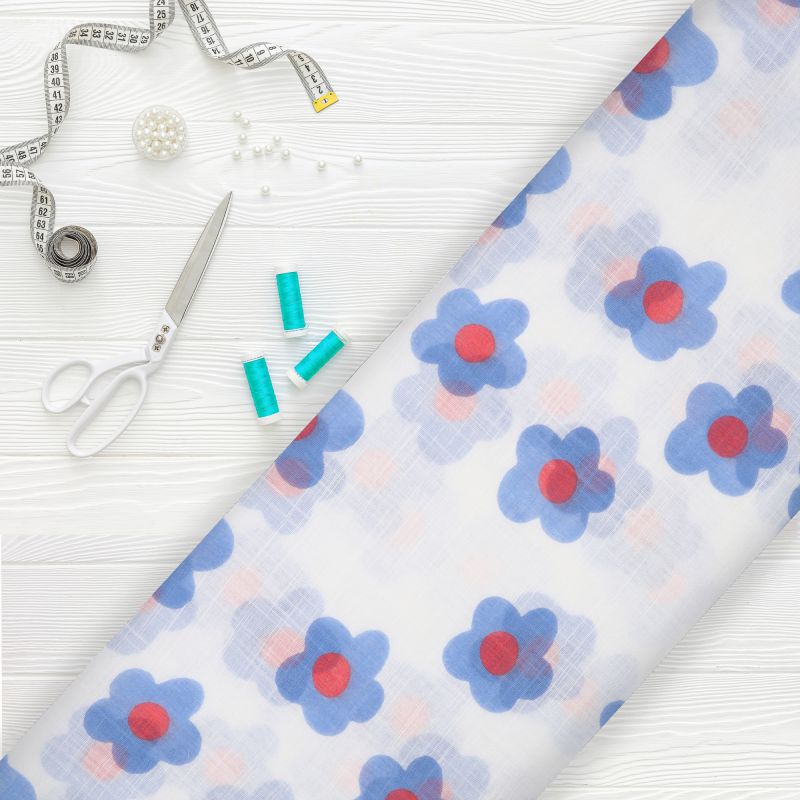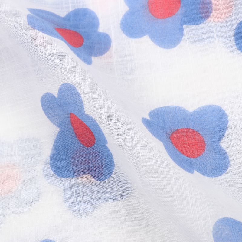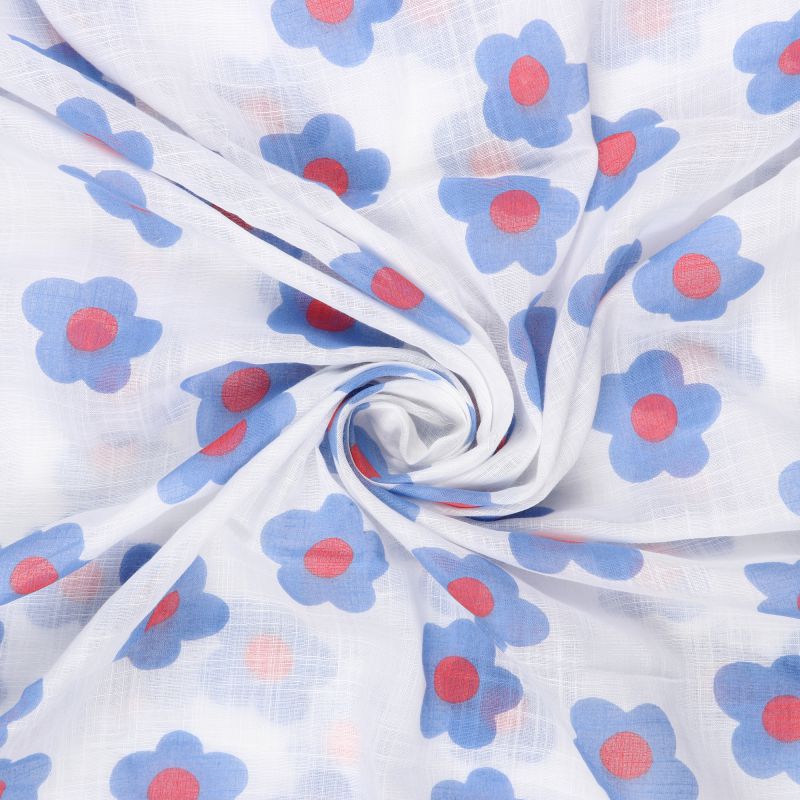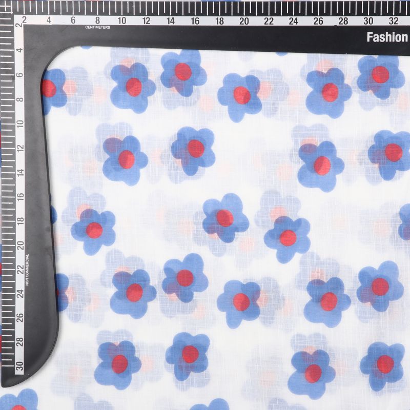 White And Blue Floral Pattern Screen Print Cotton Slub Fabric