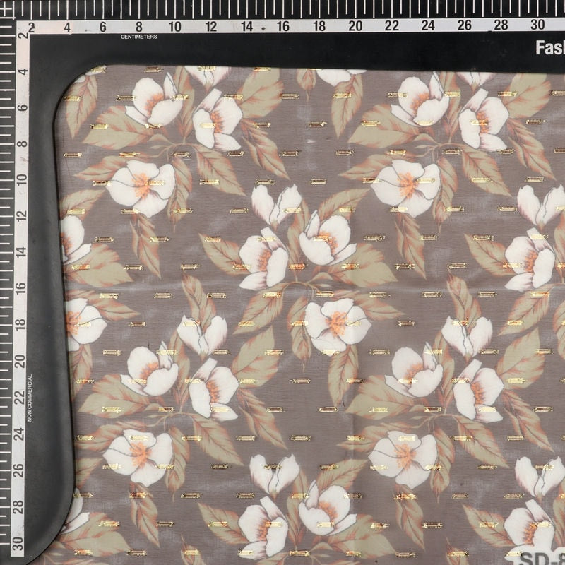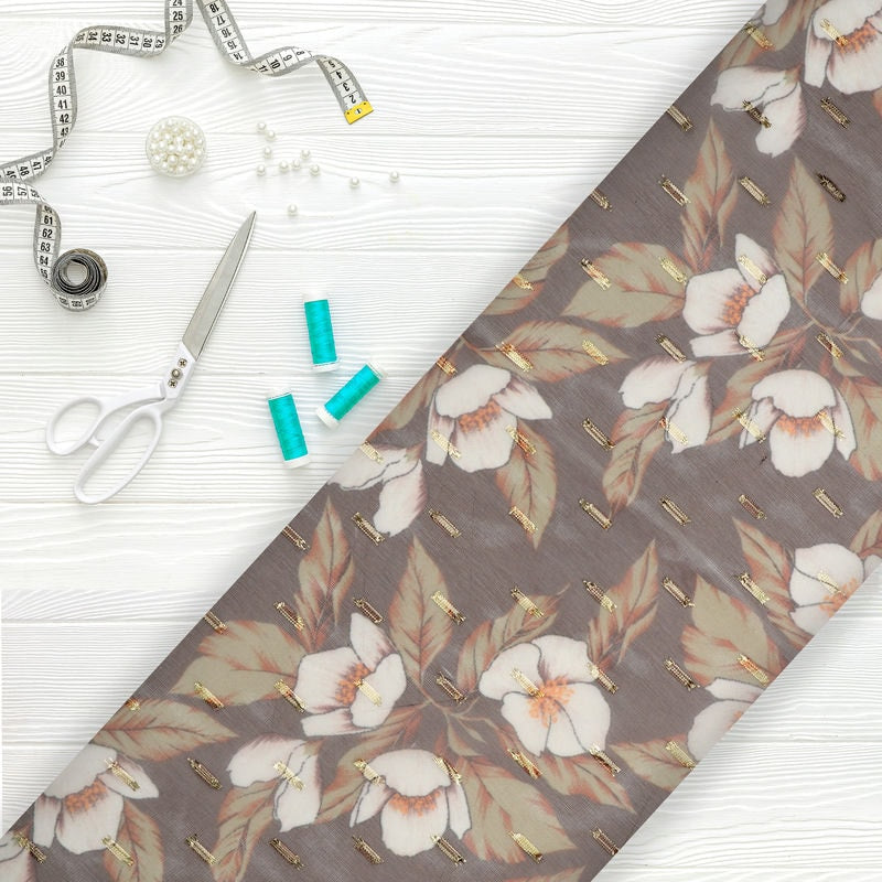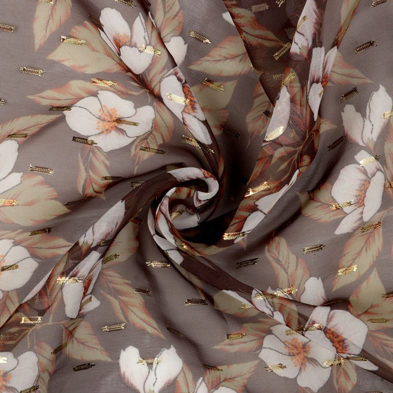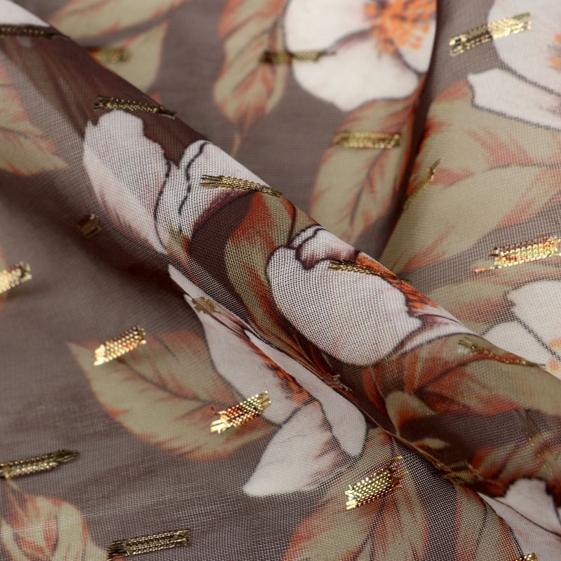 White And Coffee Brown Floral Pattern Digital Print Chiffon With Golden Zari Dobby Fabric