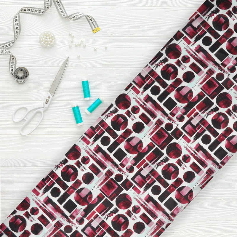 Dark Wine And White Geometric Pattern Digital Print Japan Satin Fabric