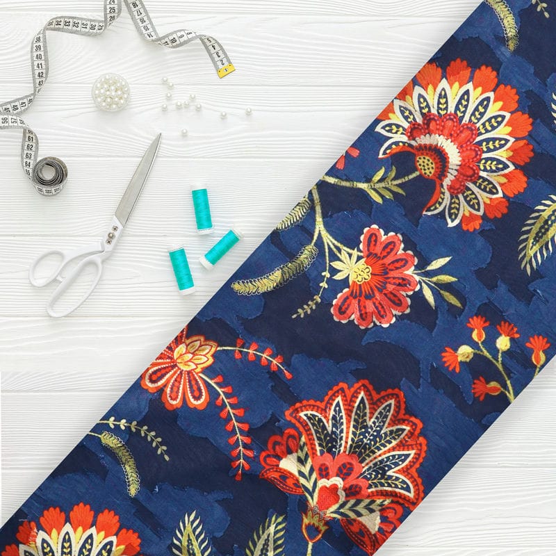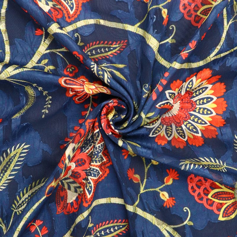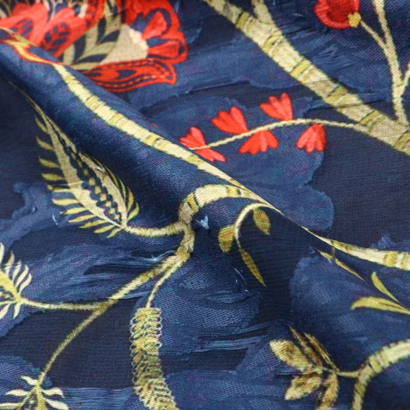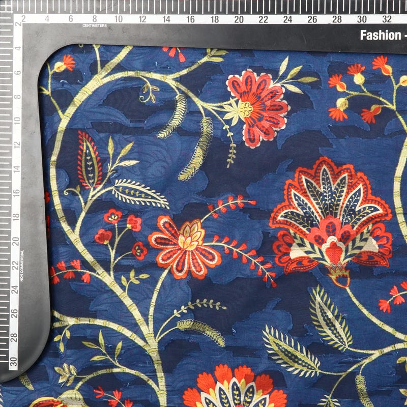 Blue And Red Floral Pattern Digital Print Jacquard Georgette Fabric