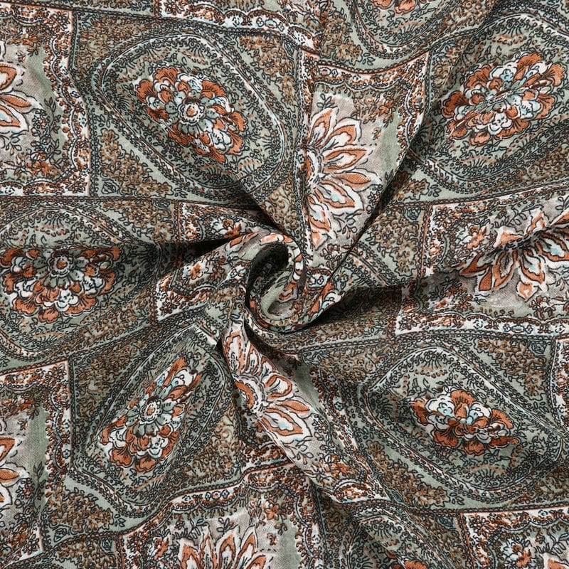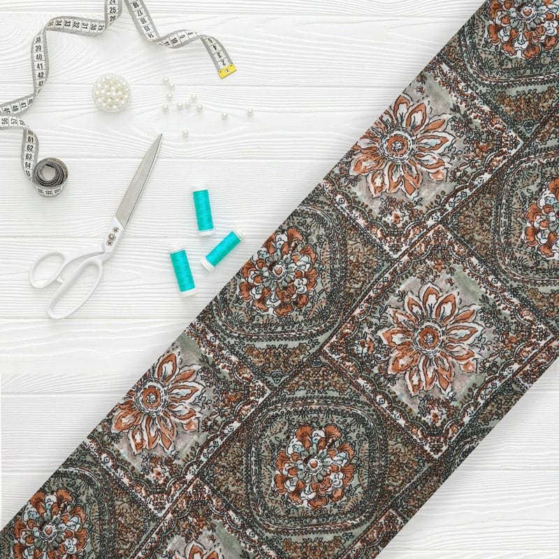 Coffee And Greyish Green Traditional Pattern Screen Print Georgette Fabric (Bulk)