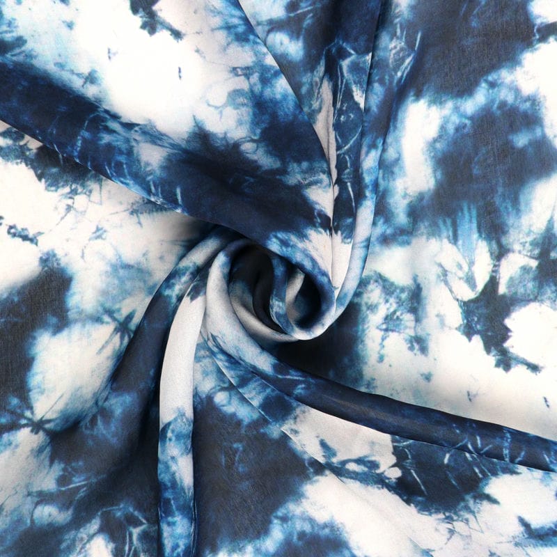Dark Blue And White Tie & Dye Pattern Digital Print Georgette Satin Fabric