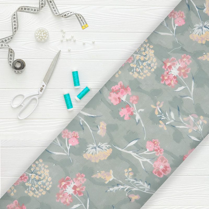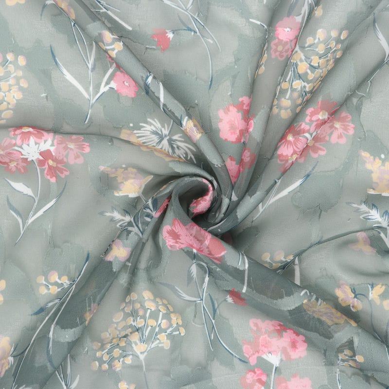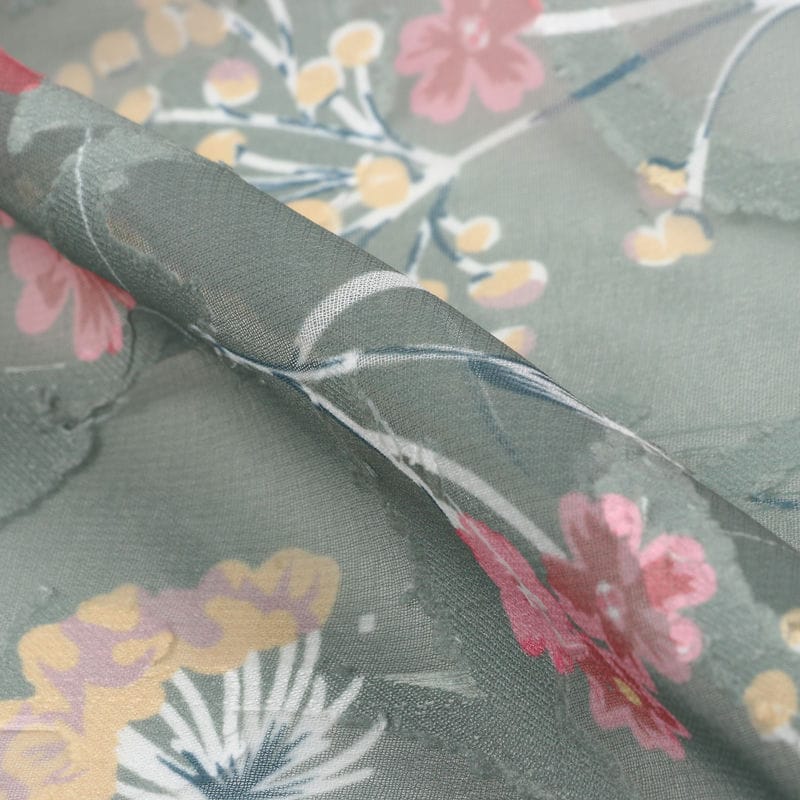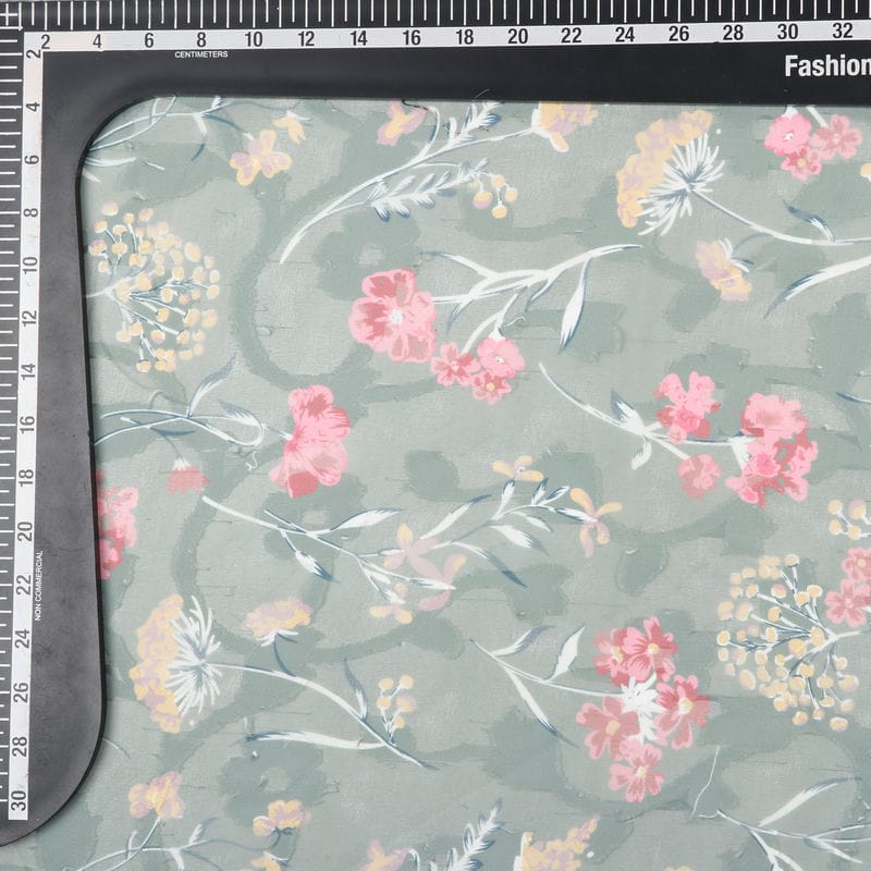 Dusty Olive Green And Pink Floral Pattern Digital Print Georgette Jacqaurd Fabric