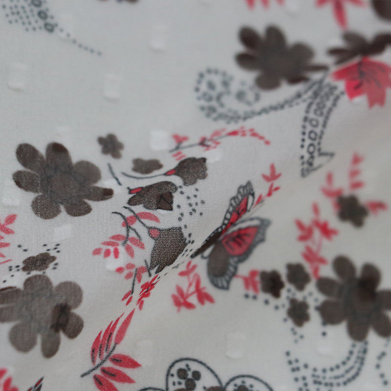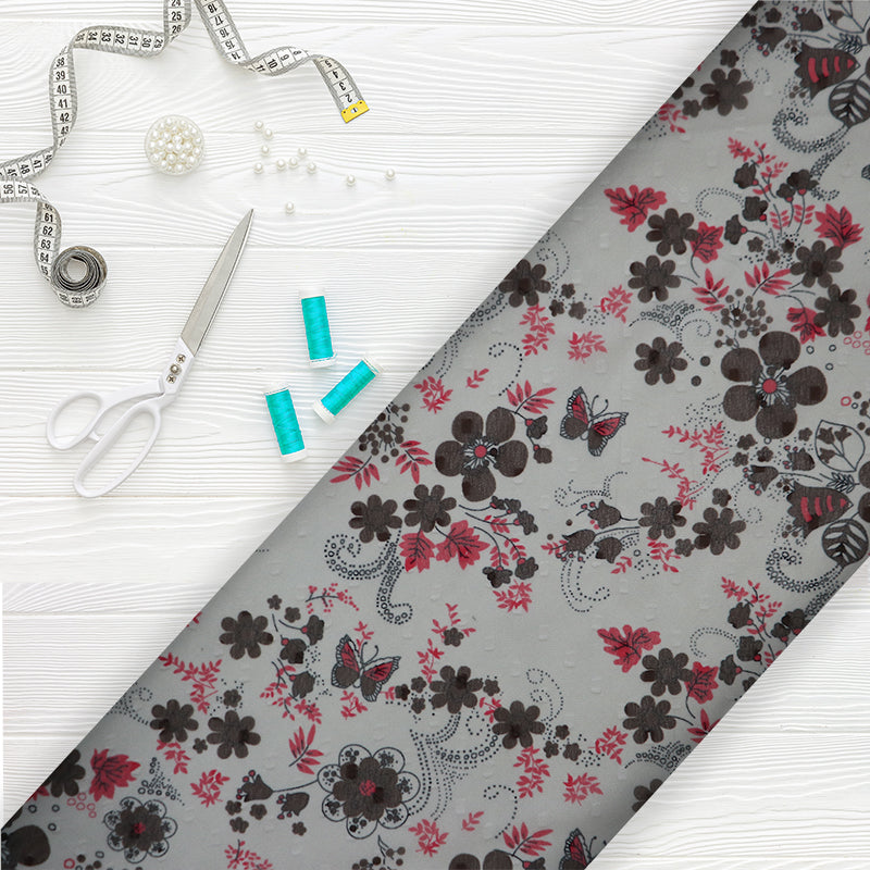 Georgette Dobby fabric is a type of polyester fabric that has a distinctive dobby weave, giving it a textured appearance. It is often printed with digital designs, which provides sharp and vibrant prints. This fabric is lightweight, durable, and easy to care for, making it a popular choice for clothing and home decor items. It has a slightly sheer appearance, drapes well, and has a soft, flowing feel.