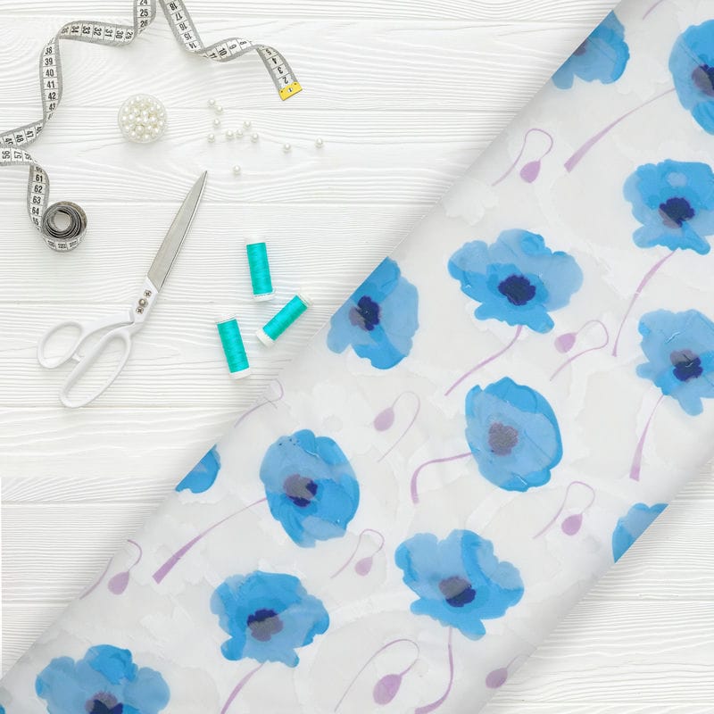 Sky Blue And White Floral Pattern Digital Print Georgette Jacquard Fabric