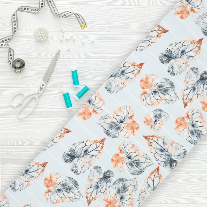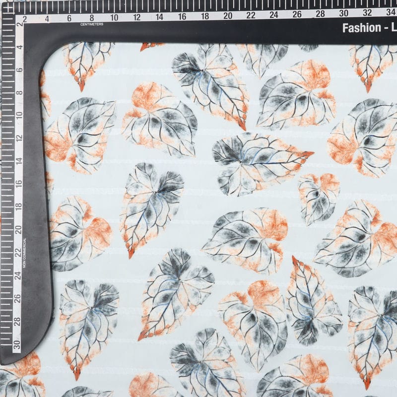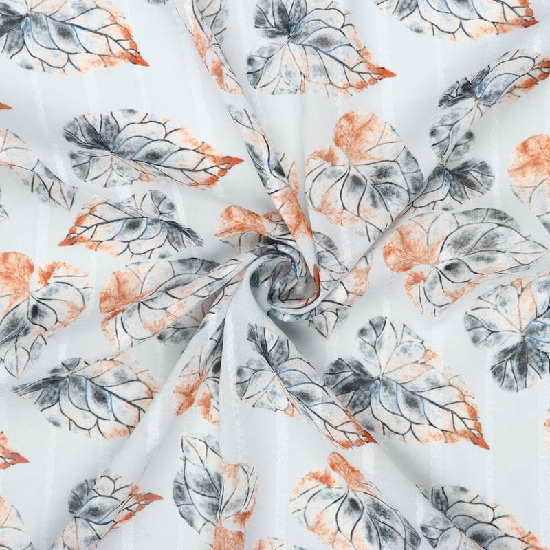 White And Rust Leaf Pattern Digital Print Stripe Jacquard Georgette Fabric