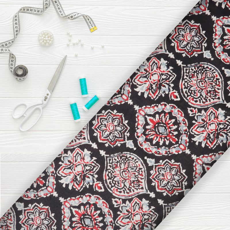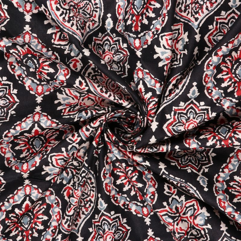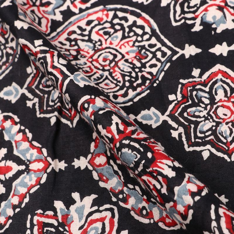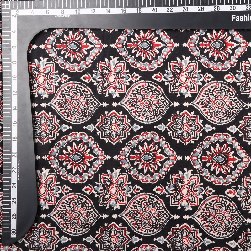 Black And Off White Traditional Kalamkari Handblock Cotton Fabric