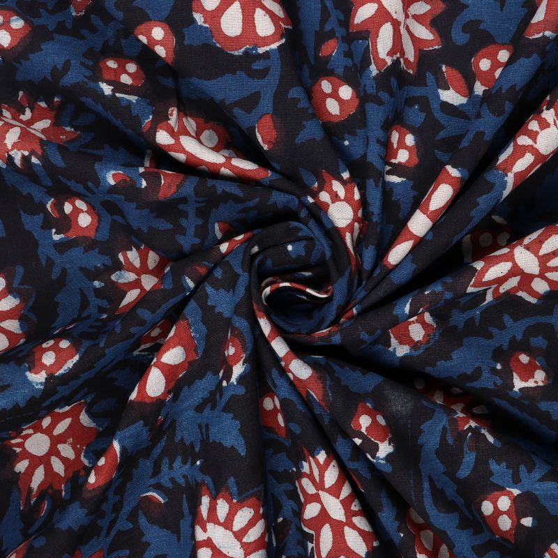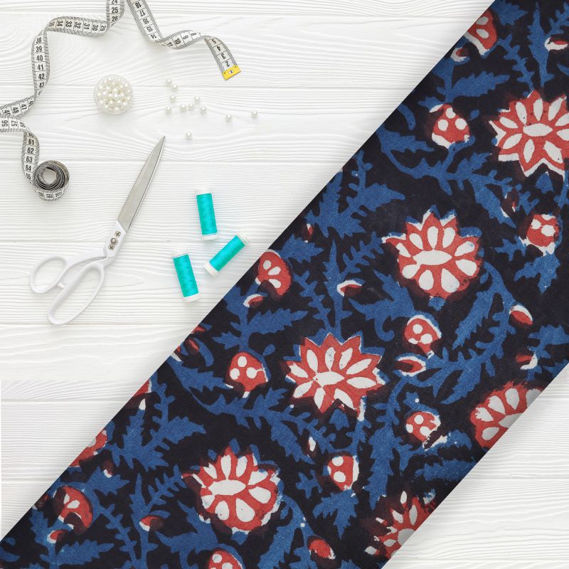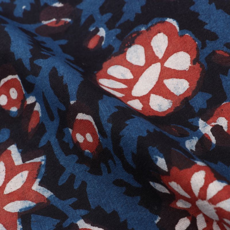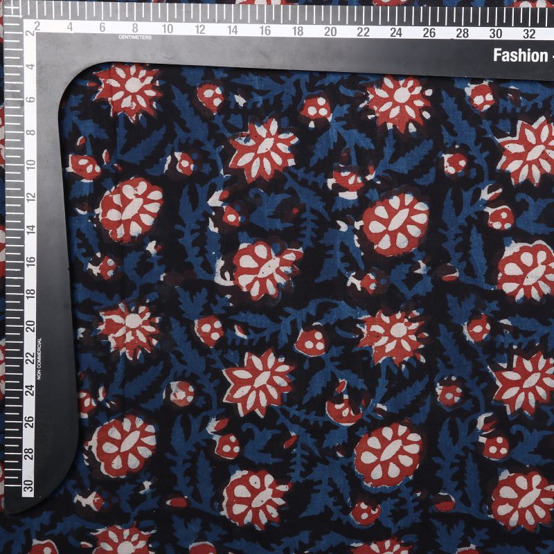 Blue And Brown Floral Kalamkari Handblock Cotton Fabric