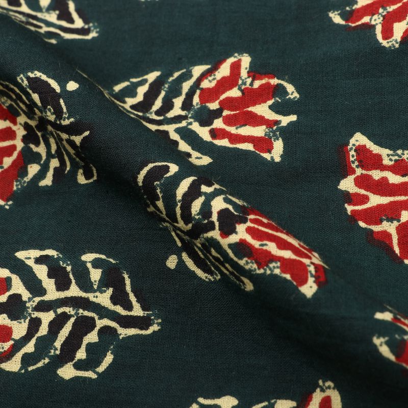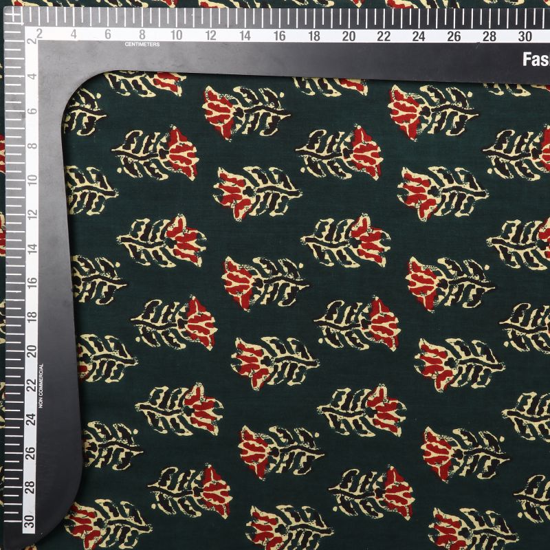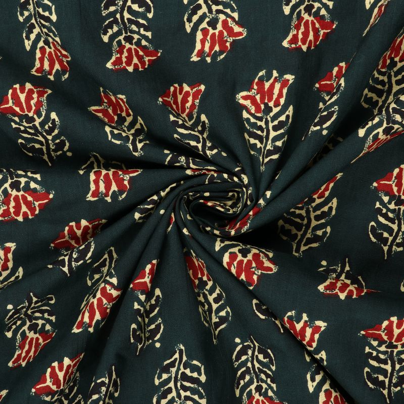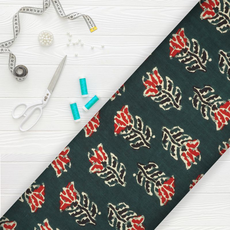 Dark Green And Red Floral Natural Dye Handblock Cotton Fabric
