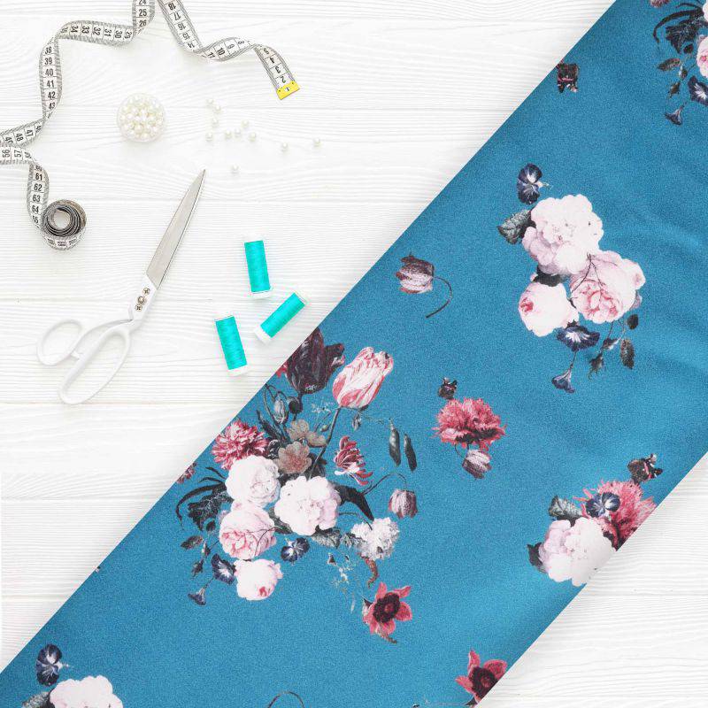 Dark Dusty Blue And Red Floral Pattern Digital Print Japan Satin Fabric