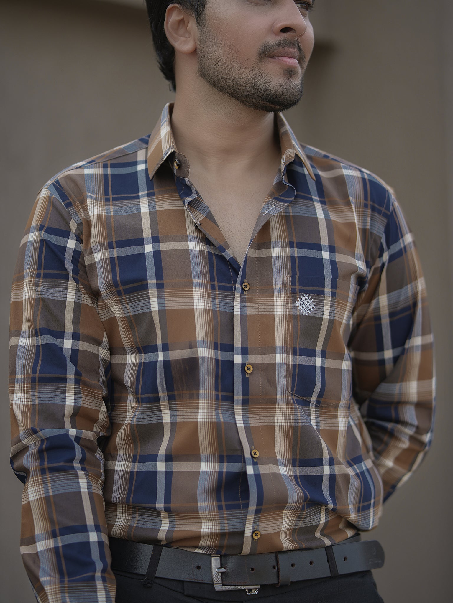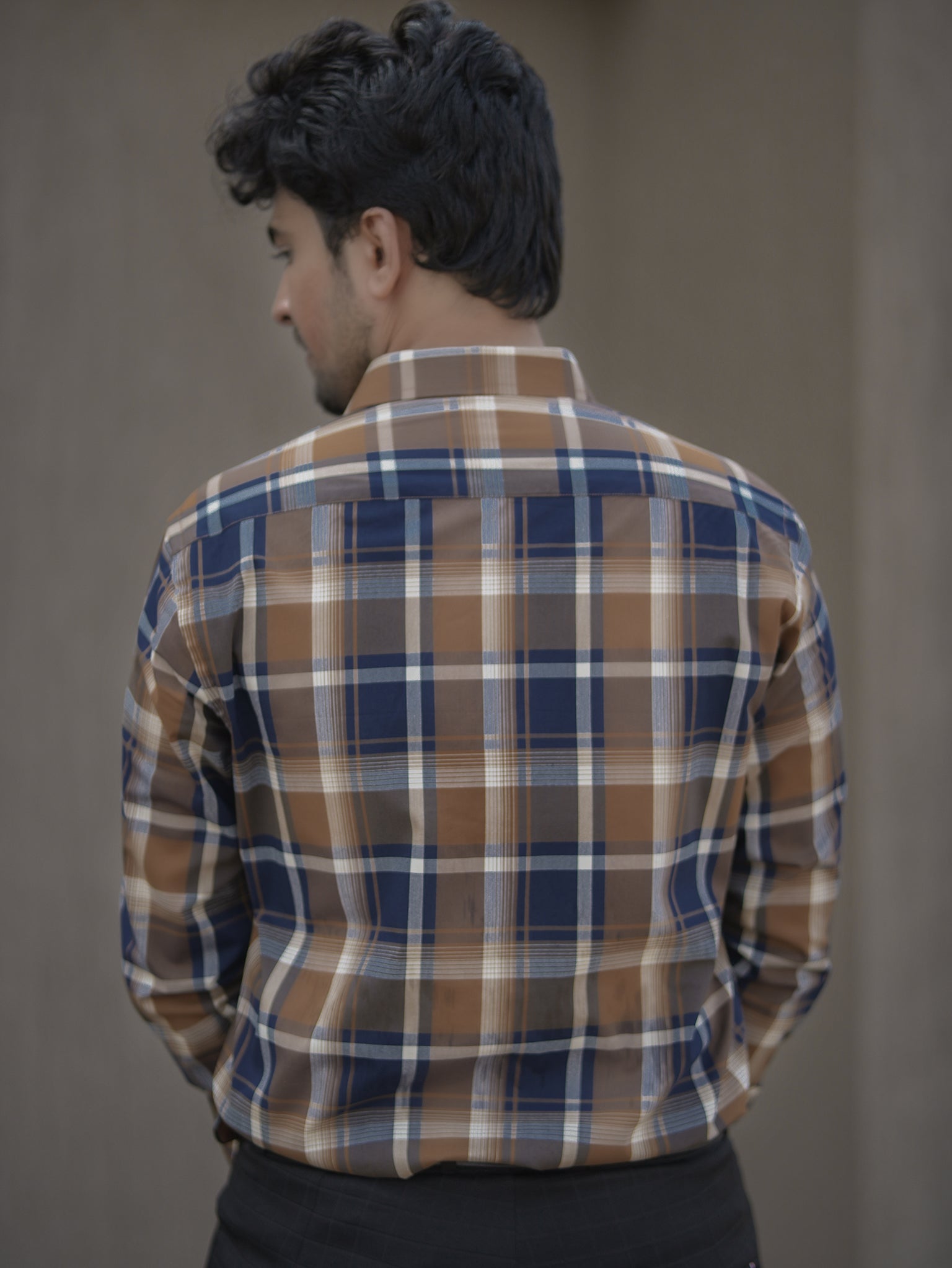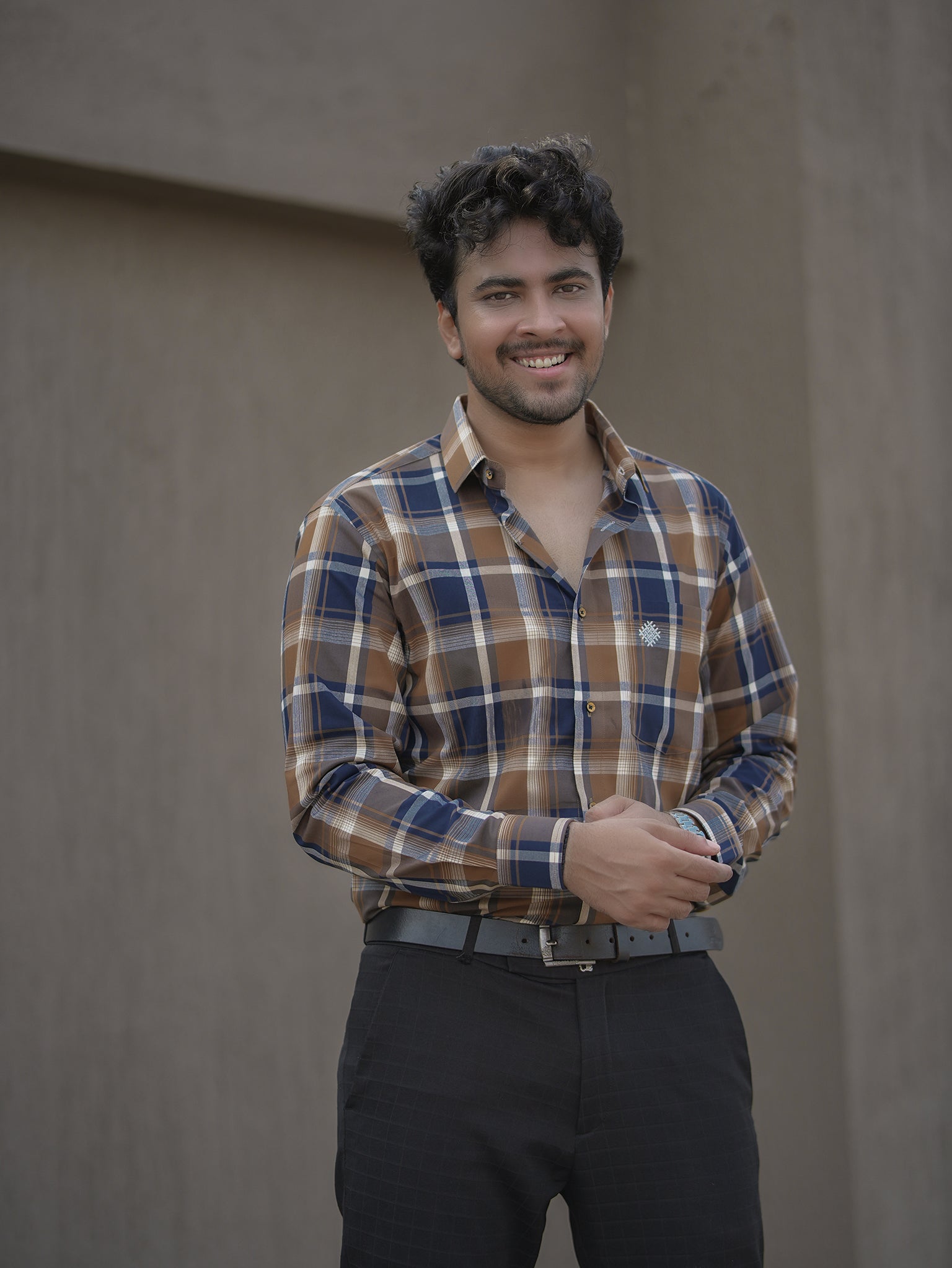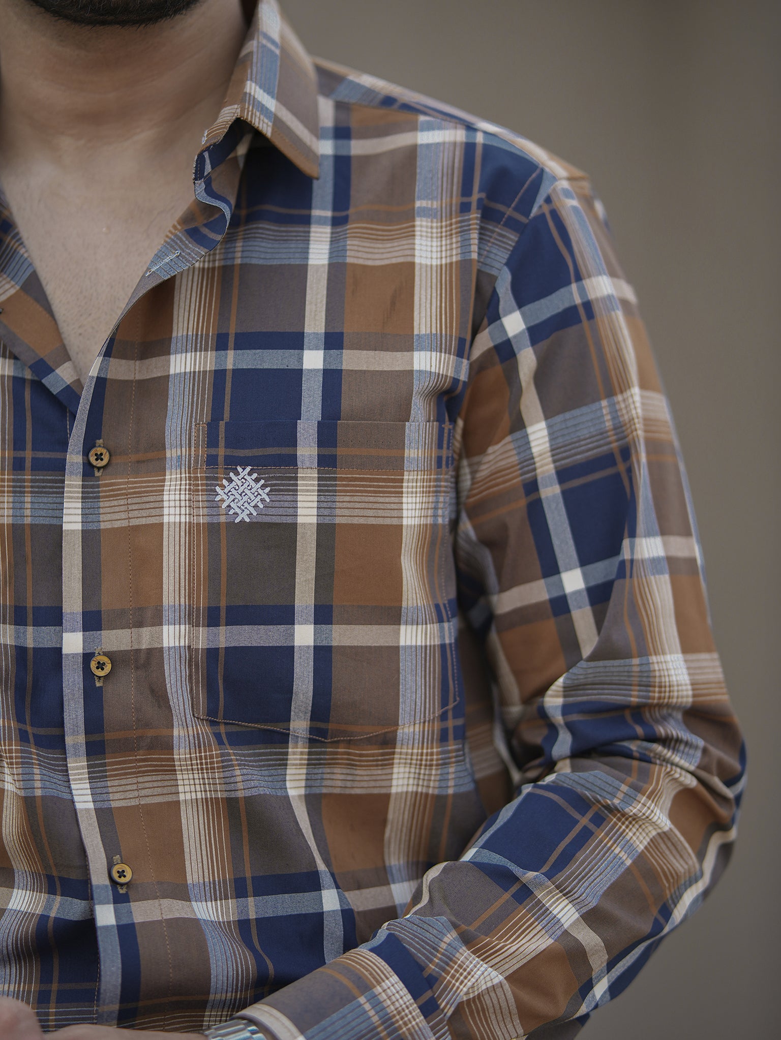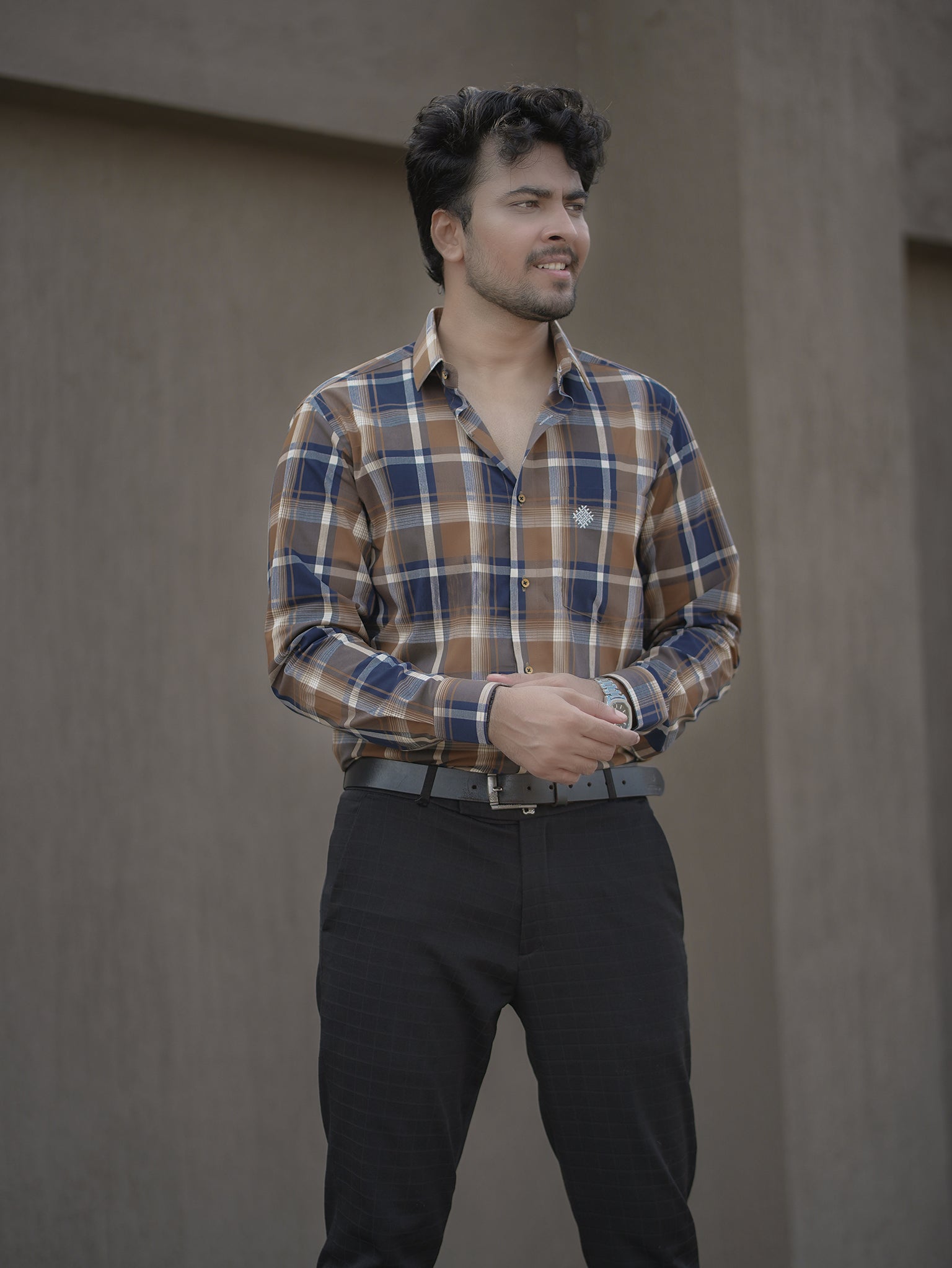 Men's Blue and Mustard Yellow Checks Pattern Cotton Shirt