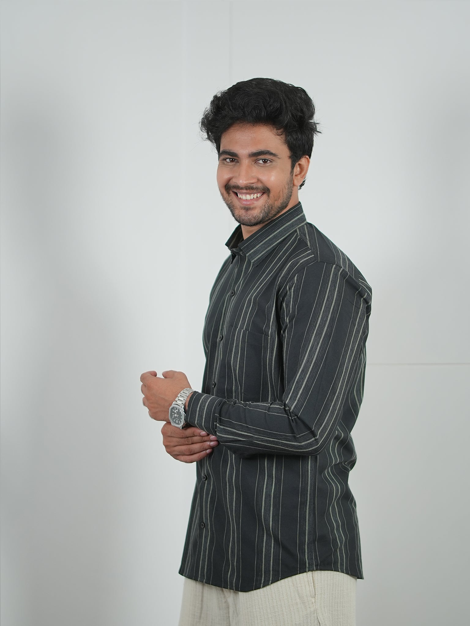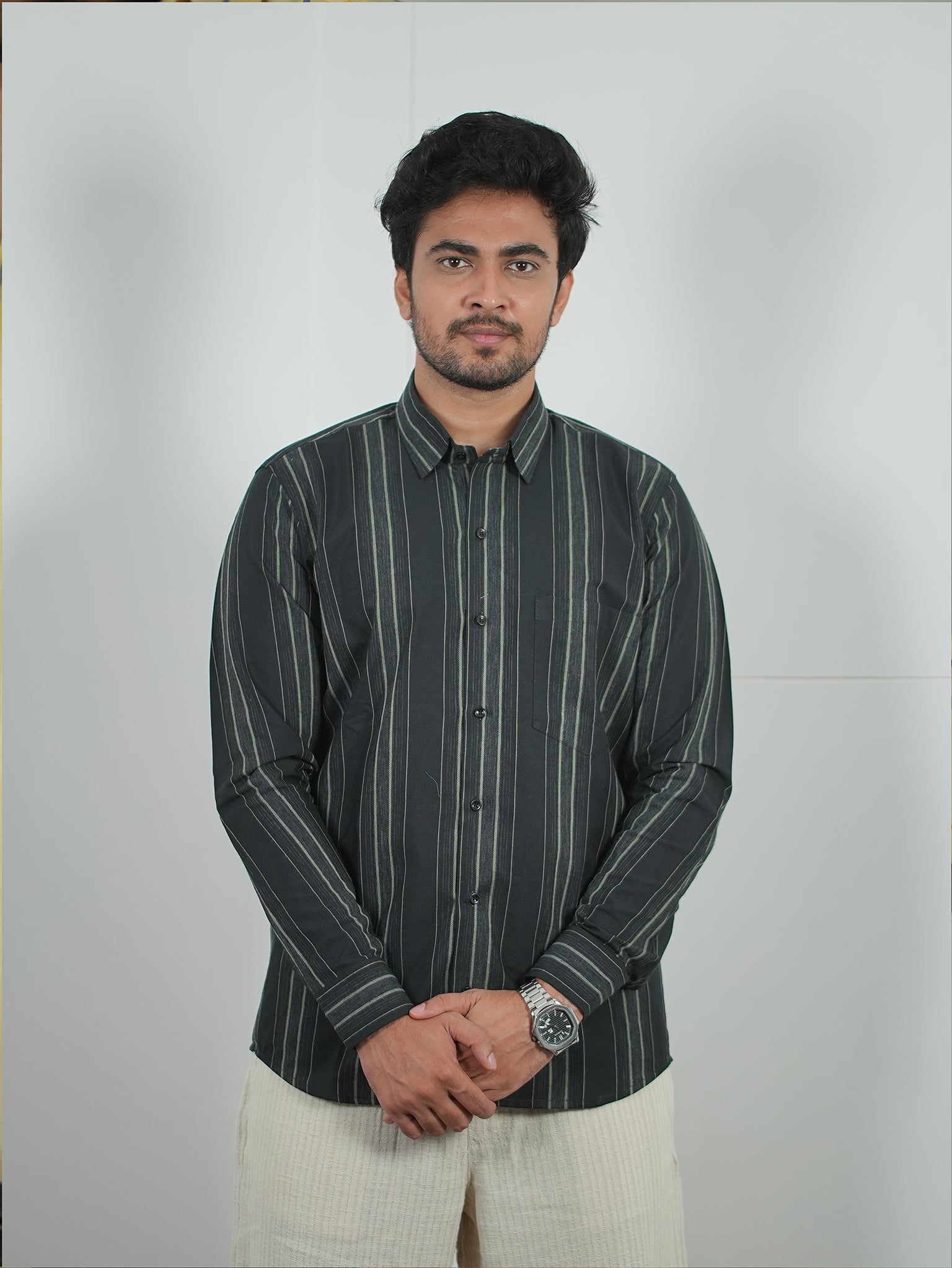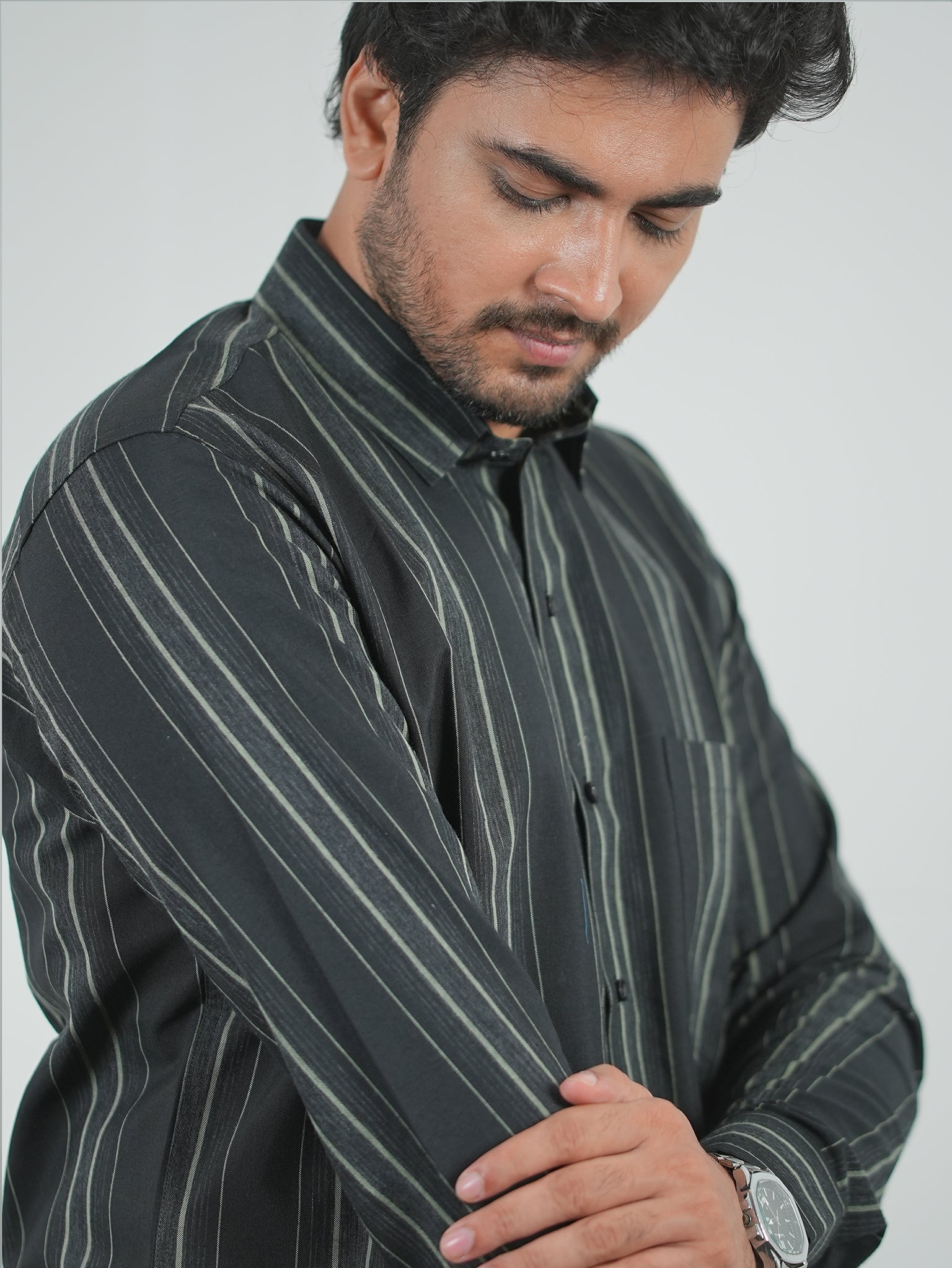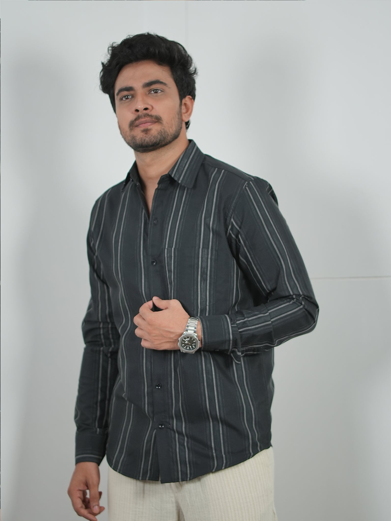 Men's Black And Grey Stripes Pattern Cotton Shirt