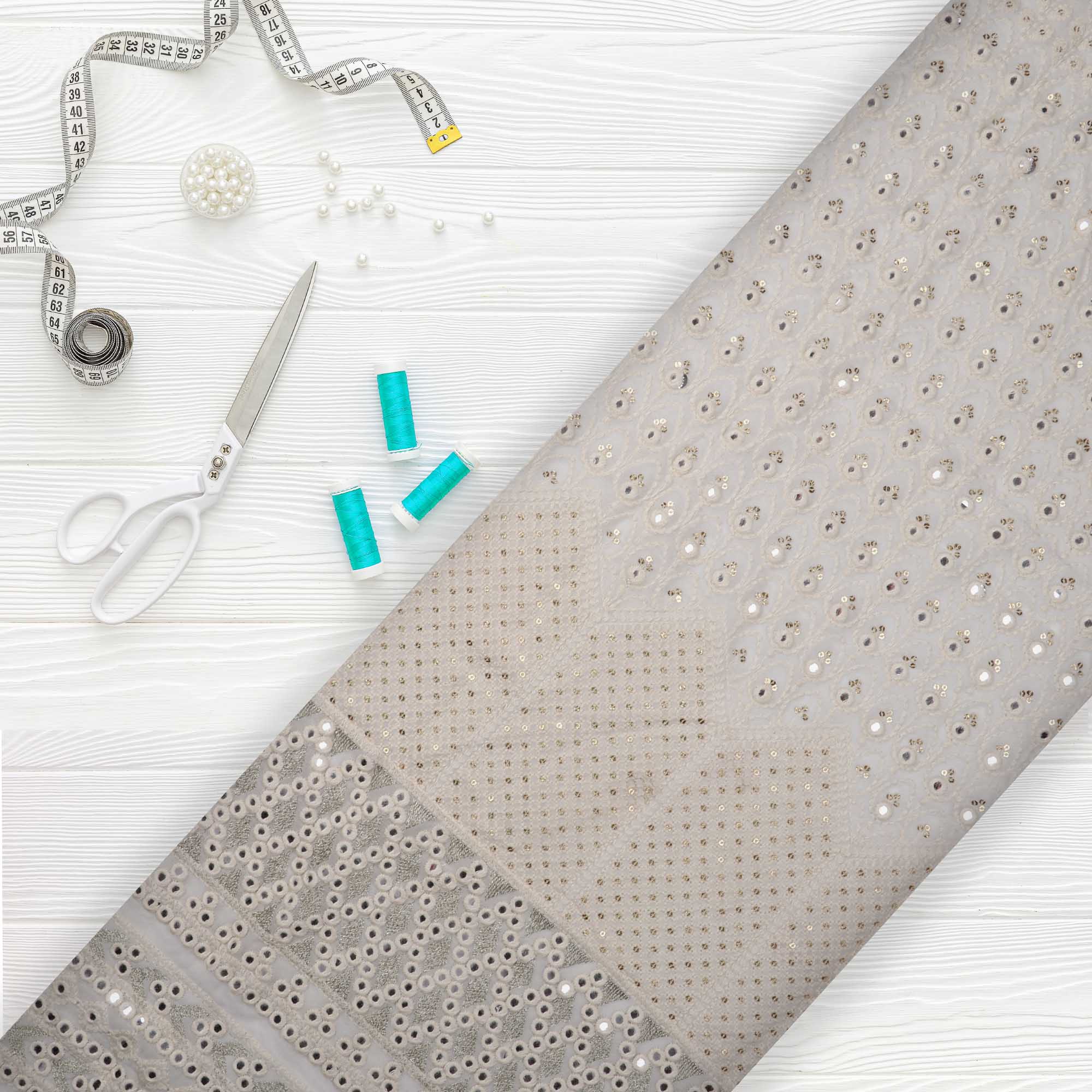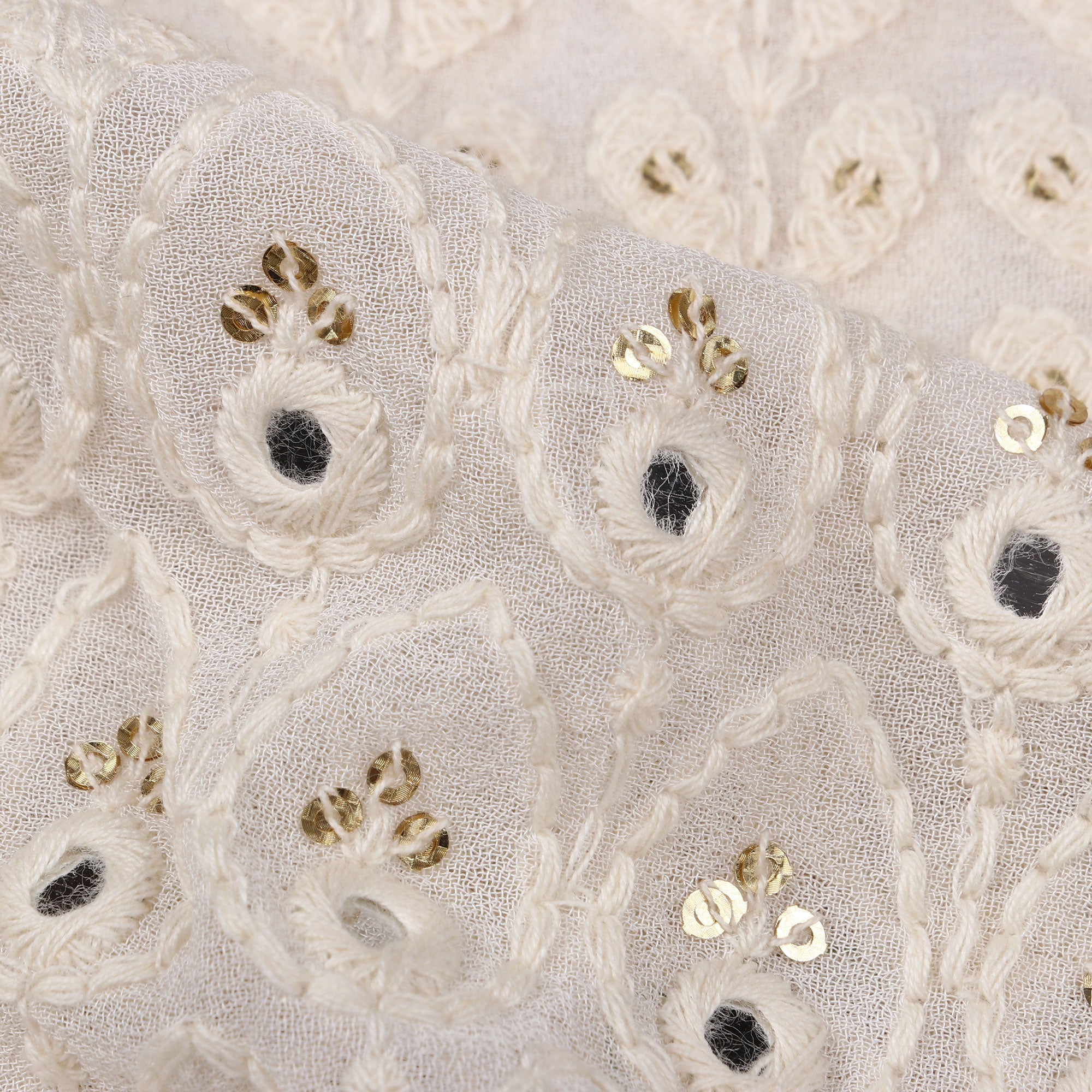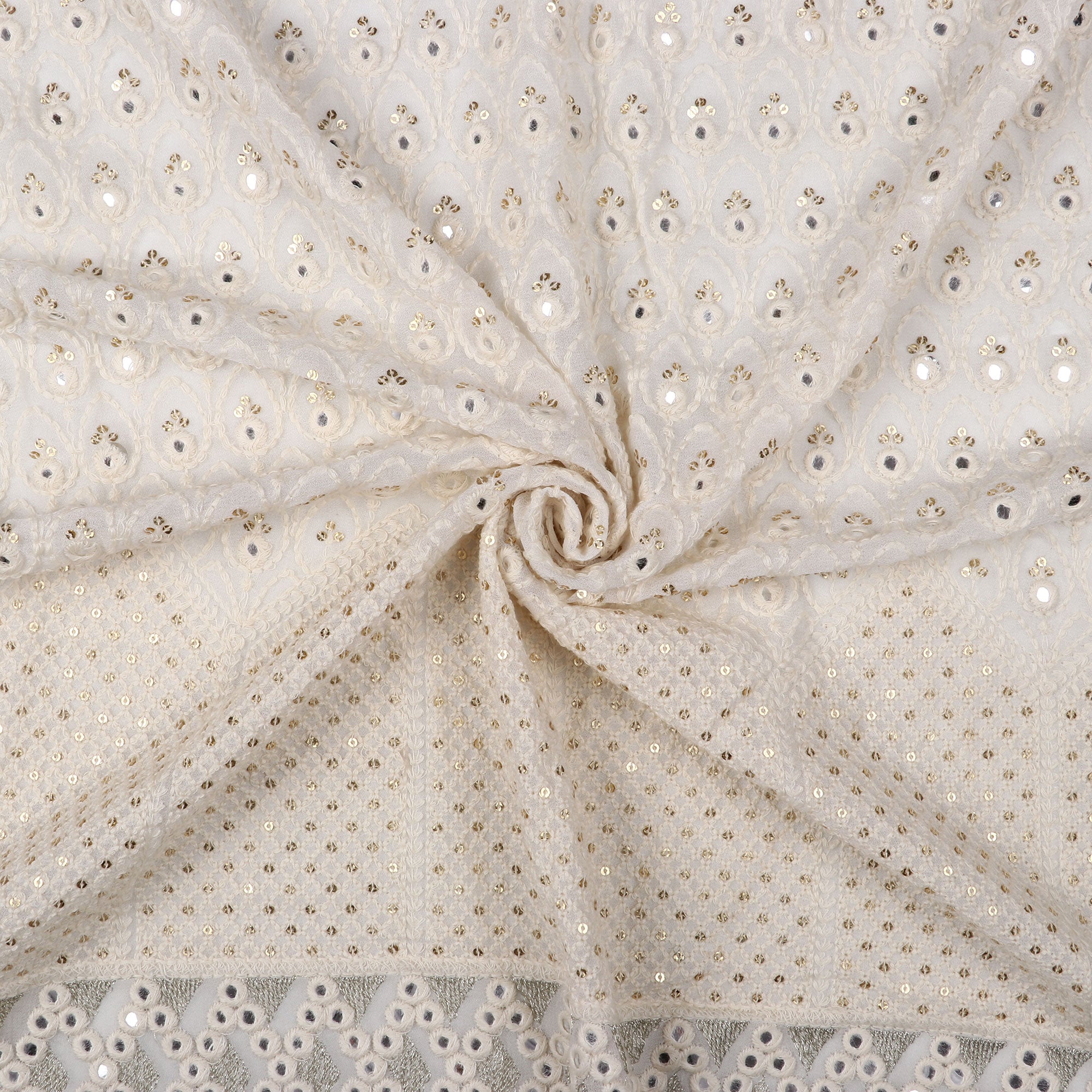 White Traditional Pattern Dyed Embroidery Sequins with Foil Mirror Work Georgette Fabric
