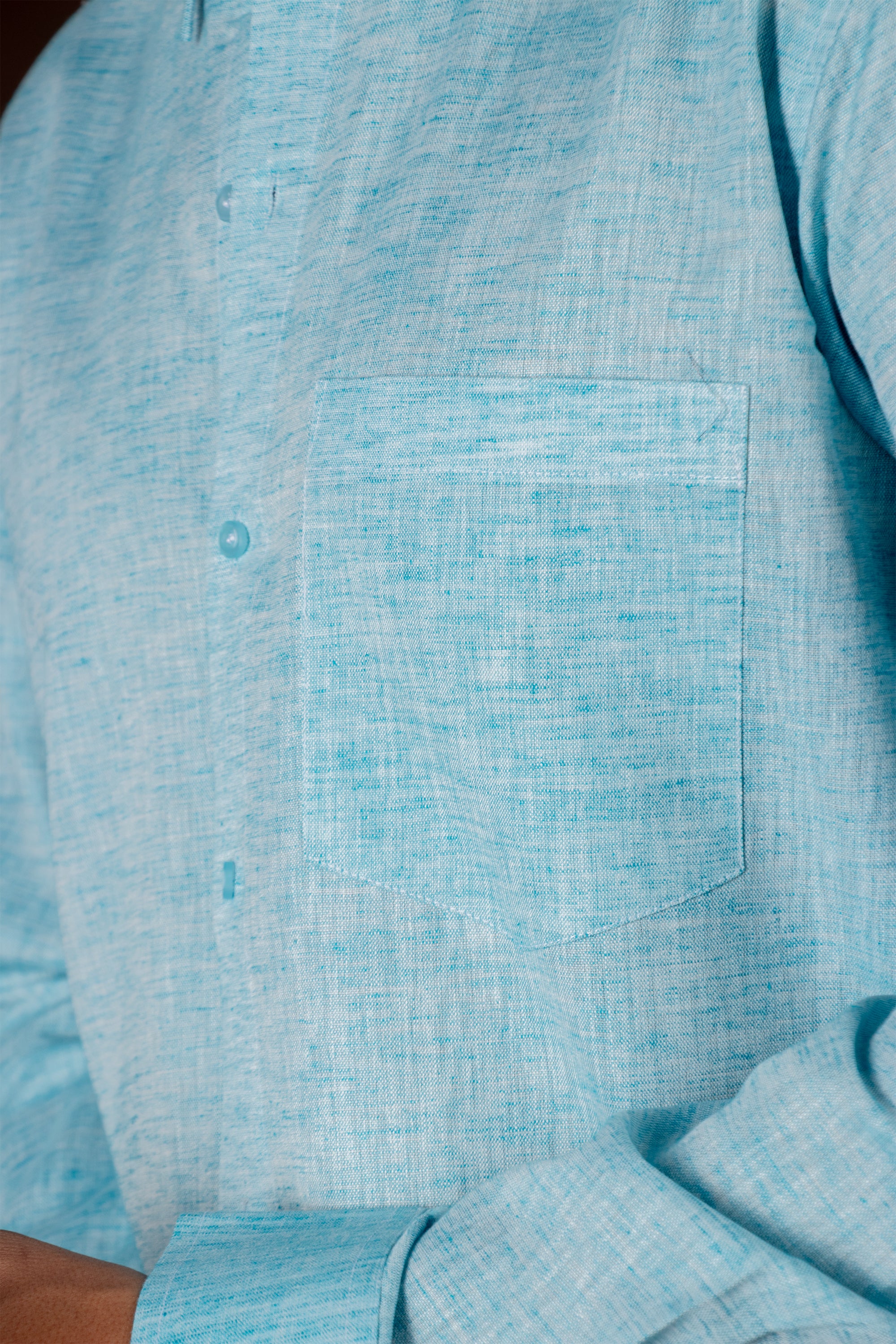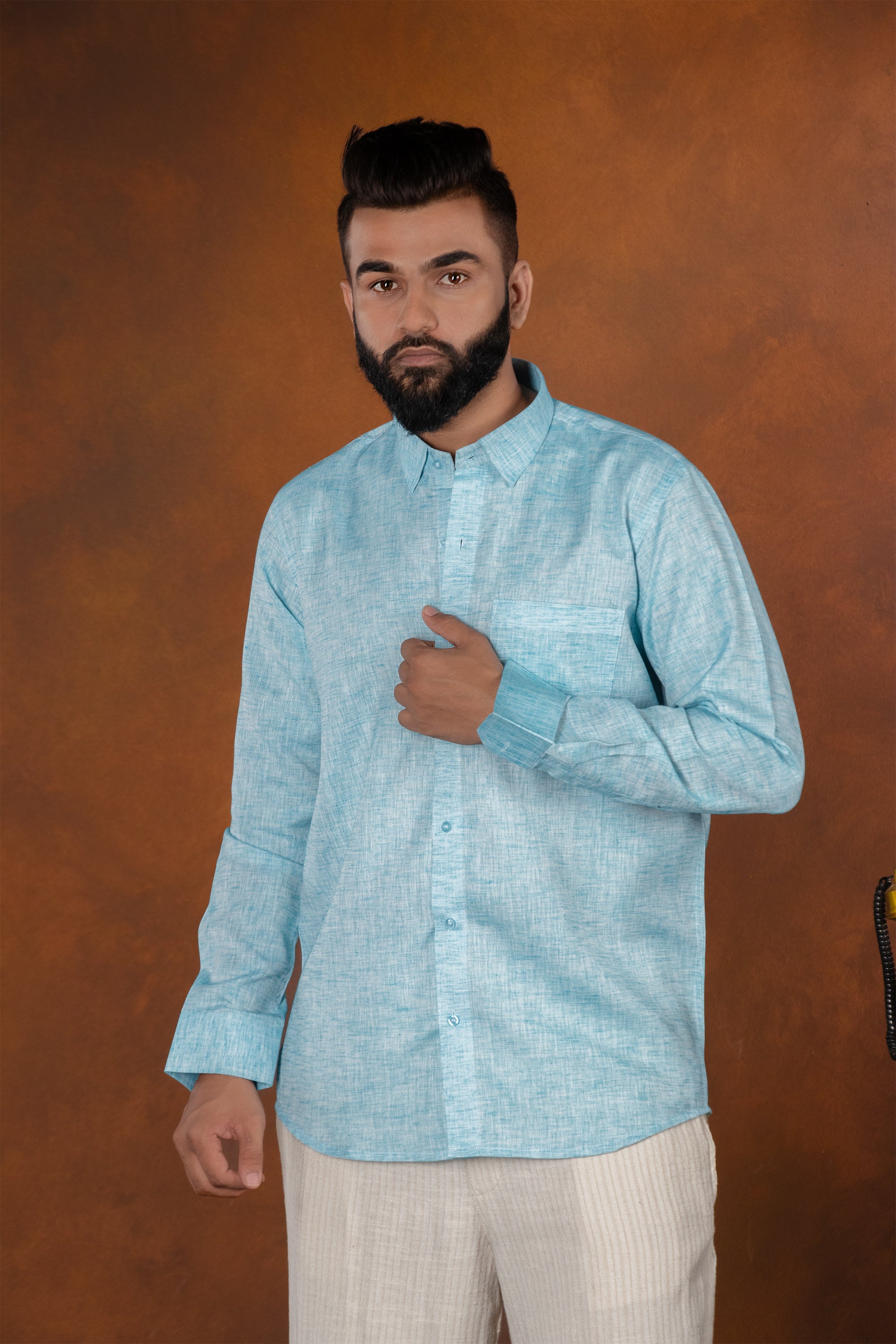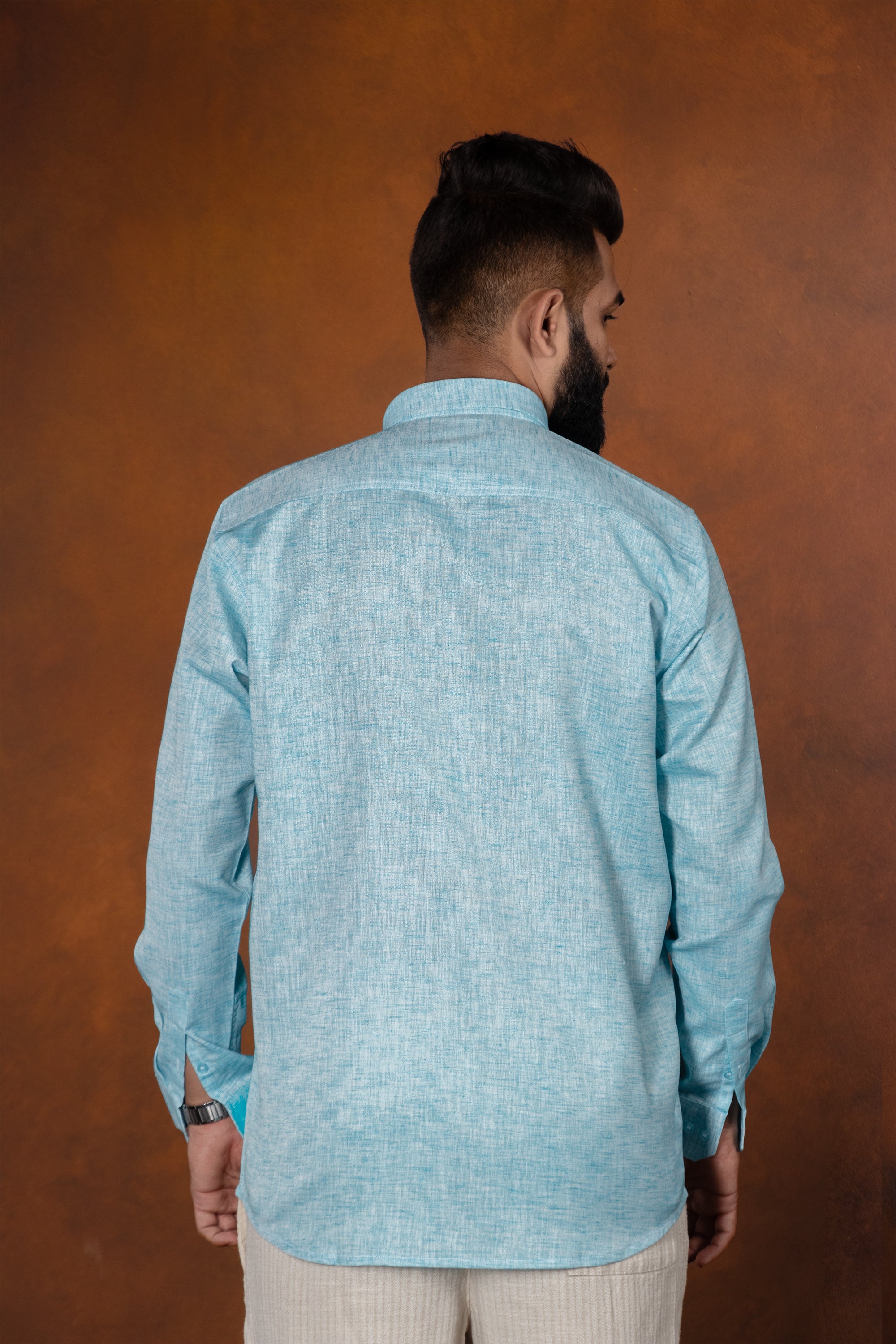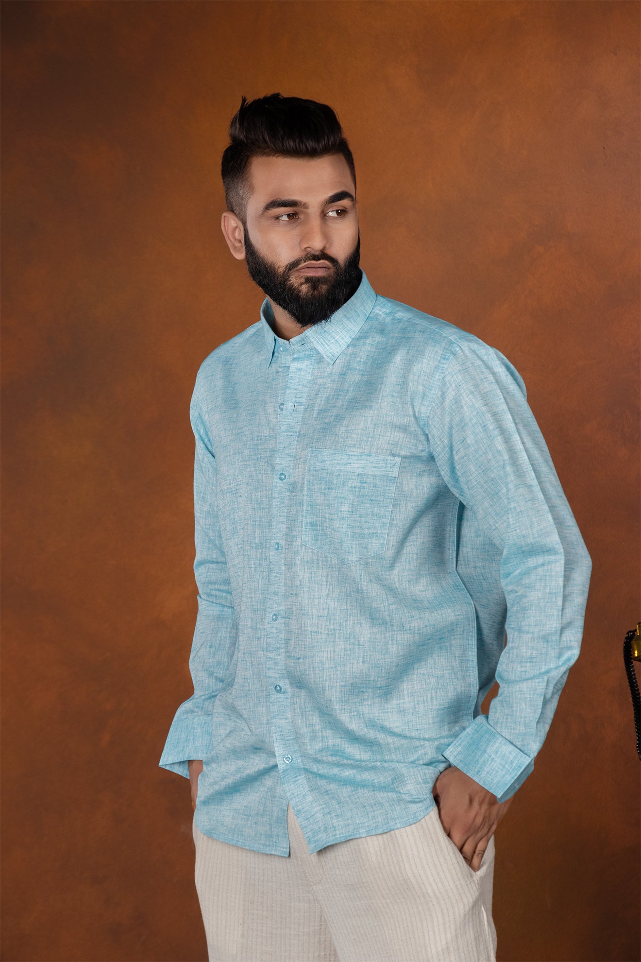 Men's Aqua Blue Dyed Cotton Linen Shirt