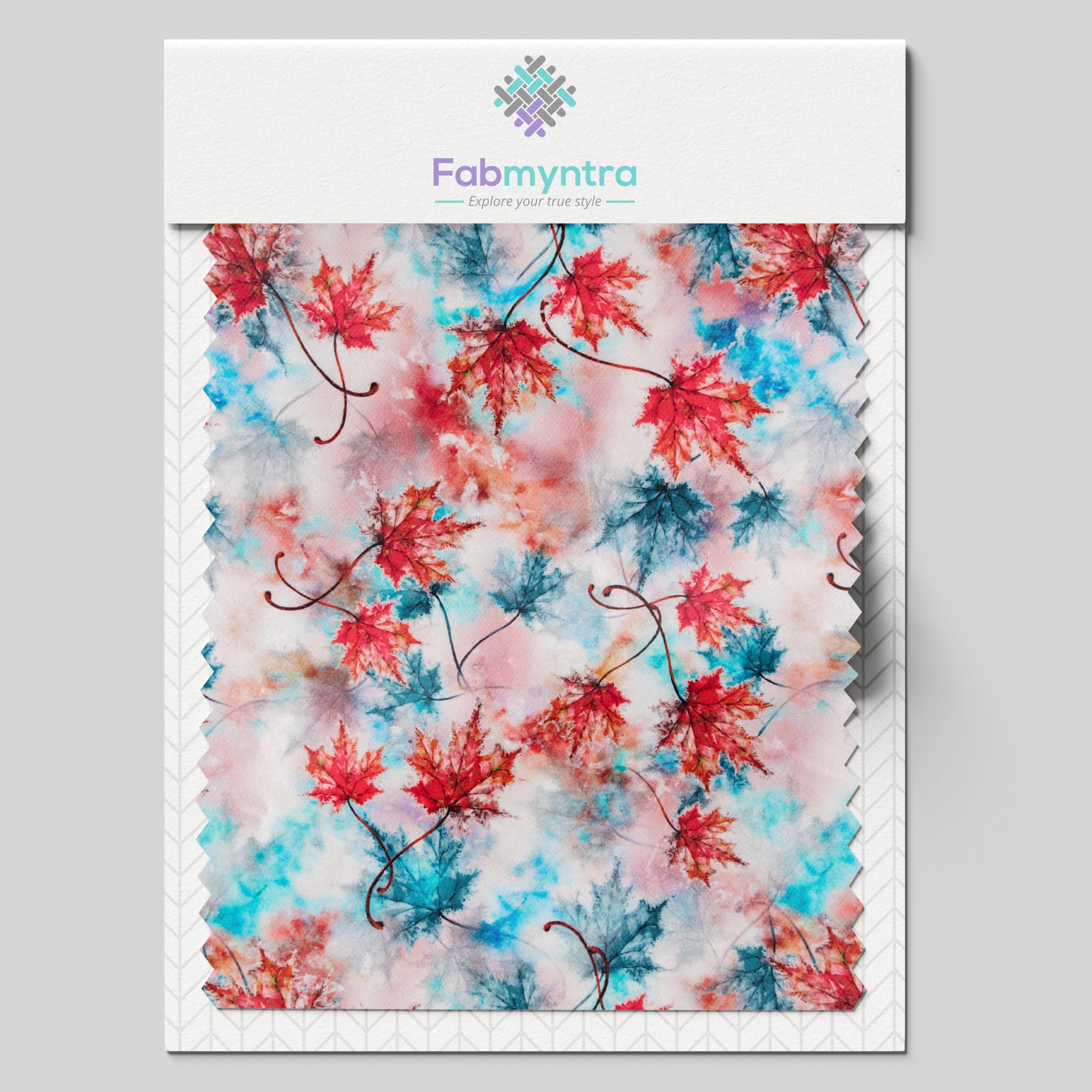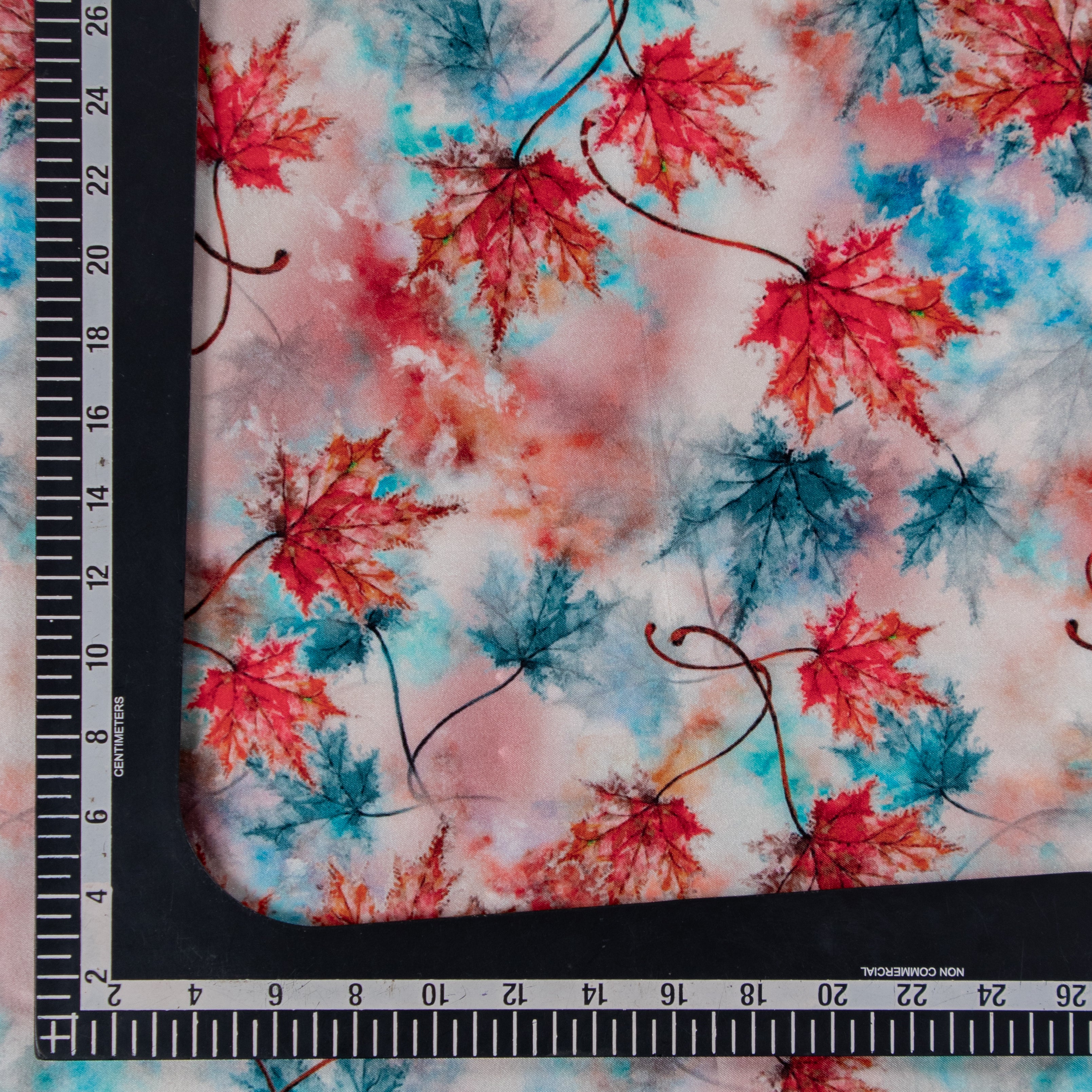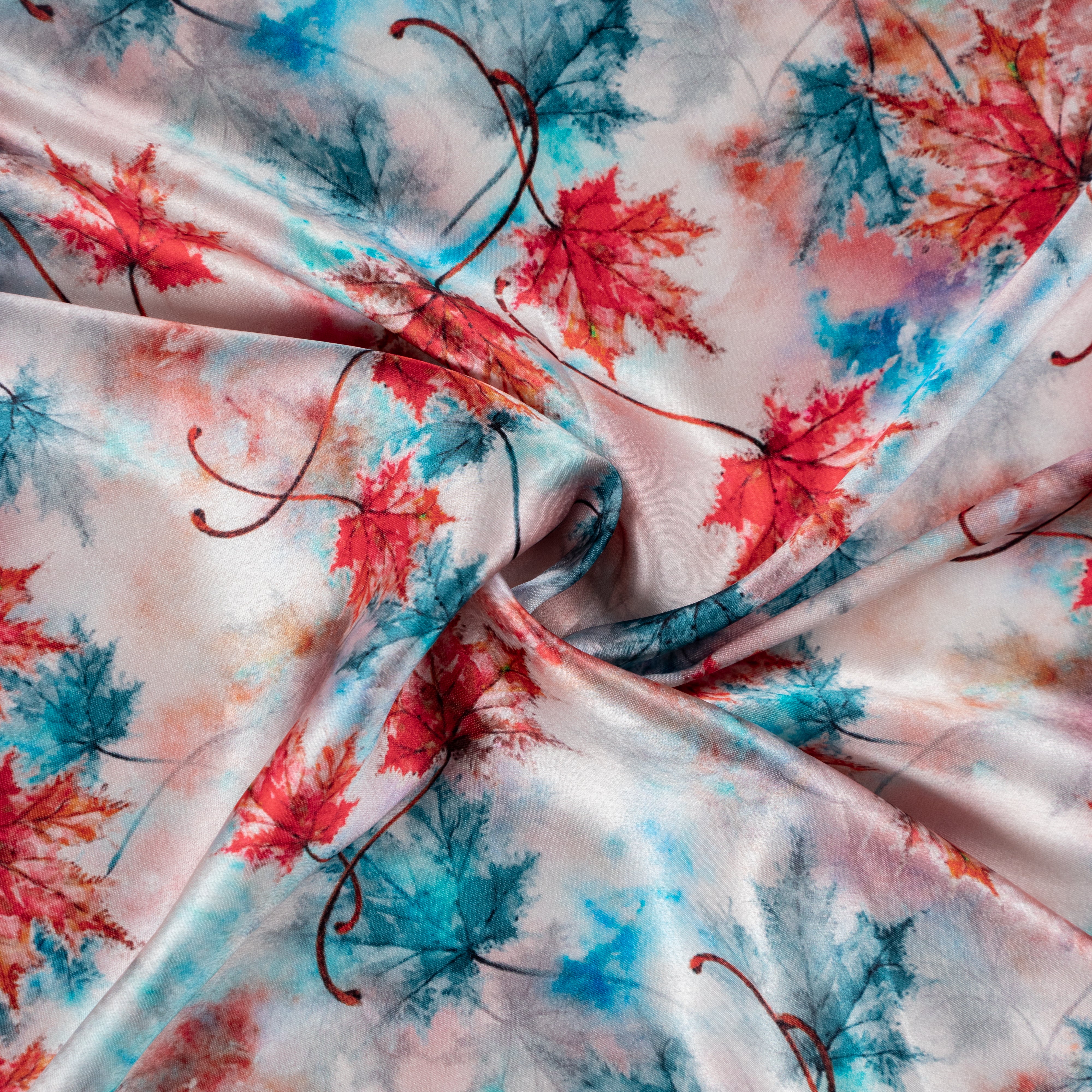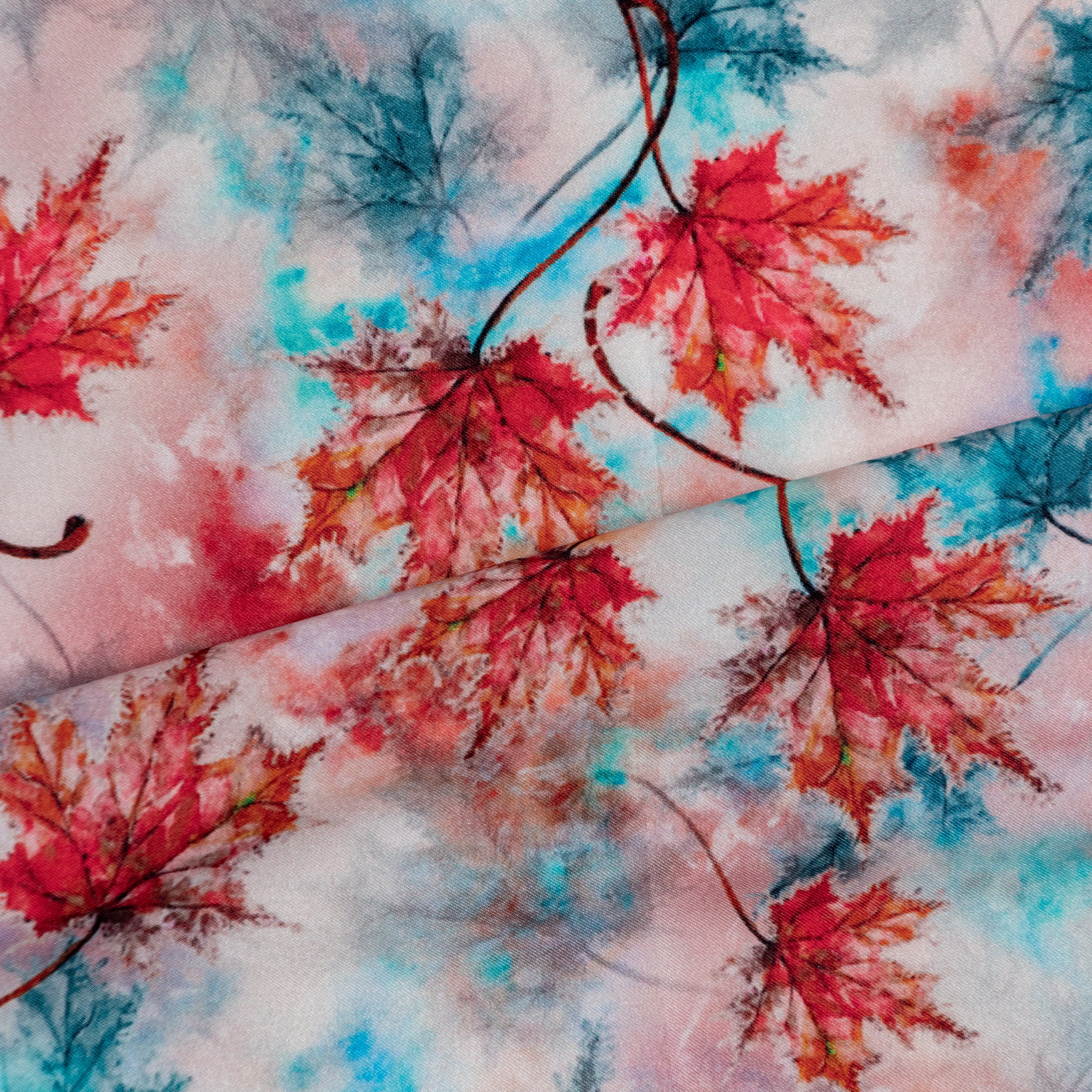Blue And Red Color Maple Leaf Pattern Digital Print Japan Satin Fabric.