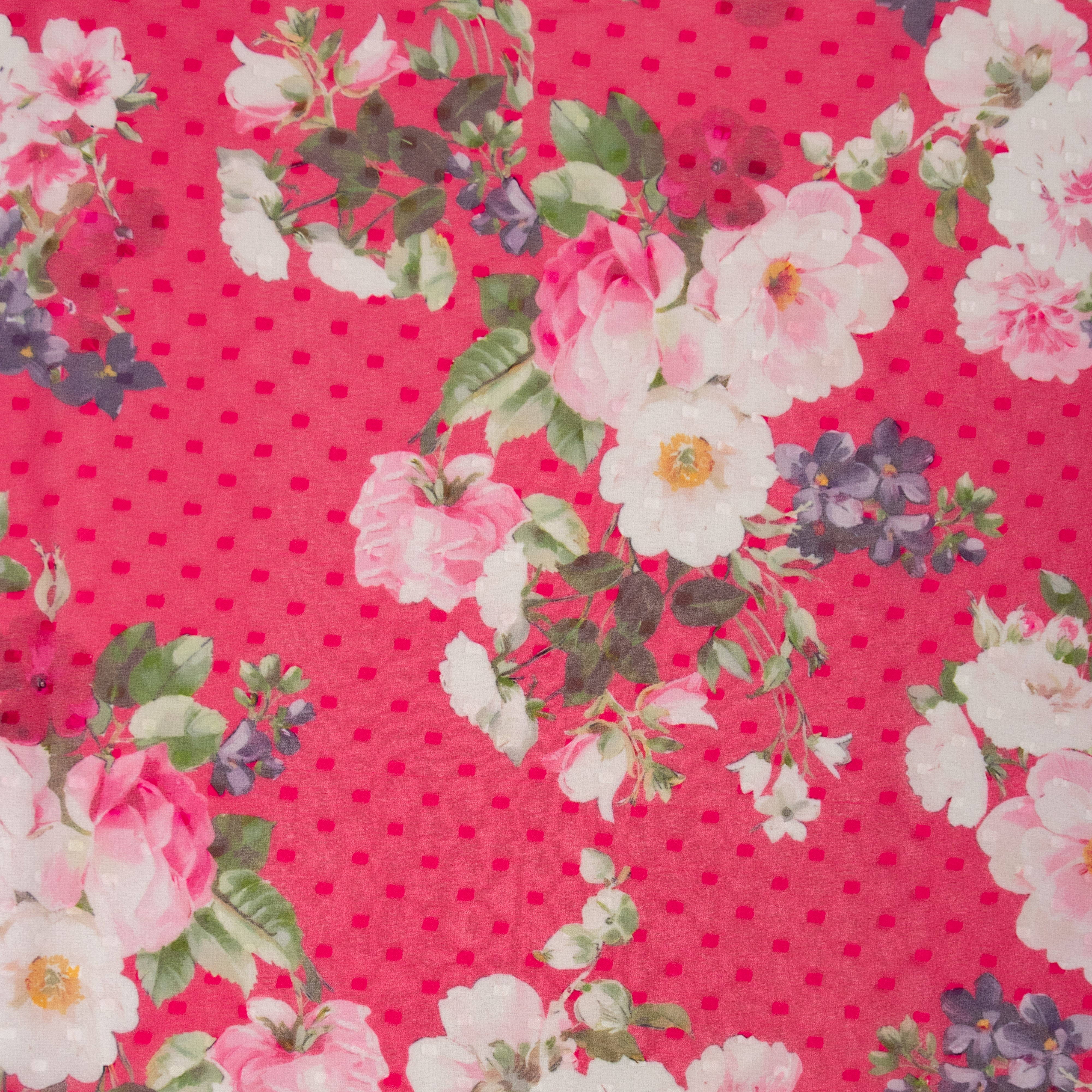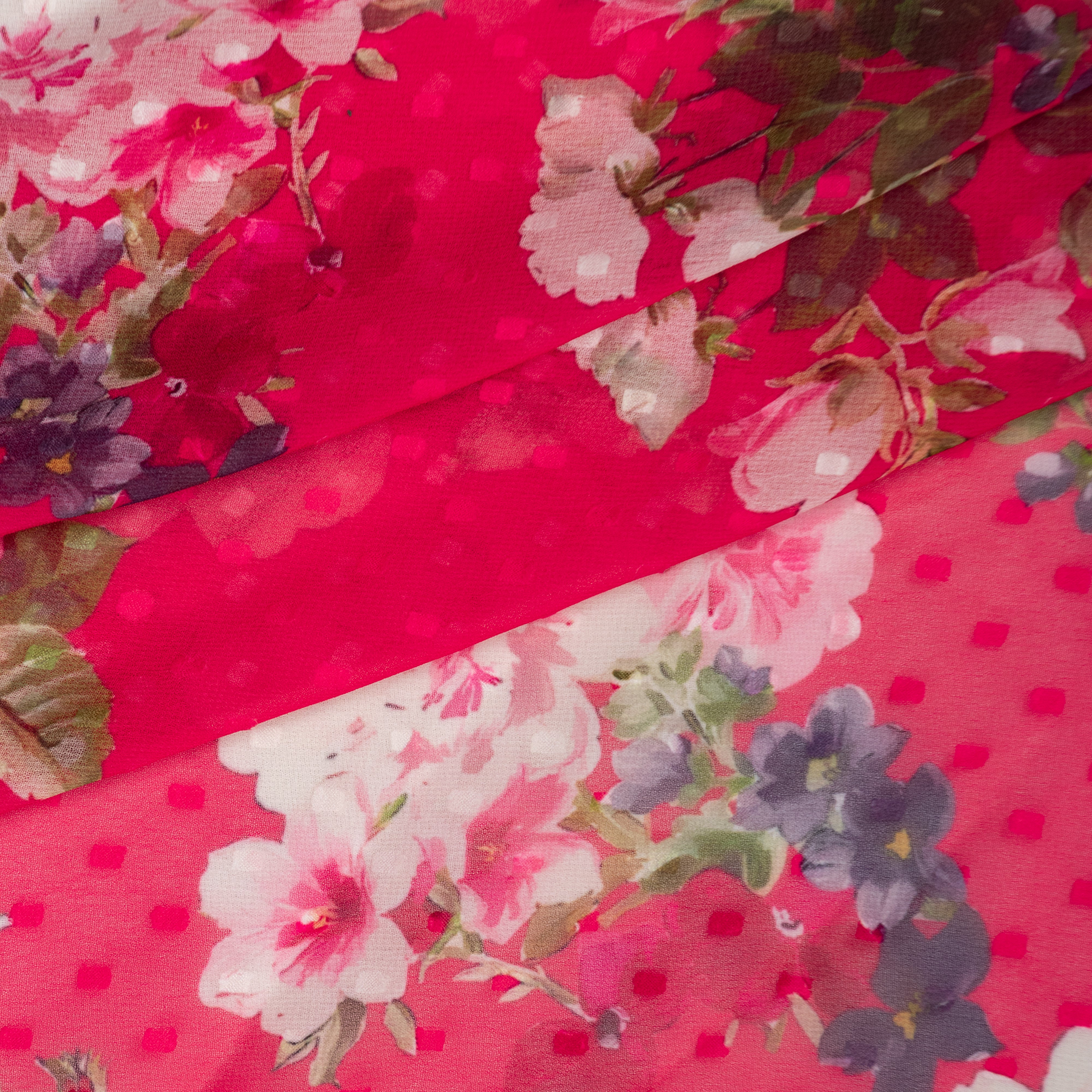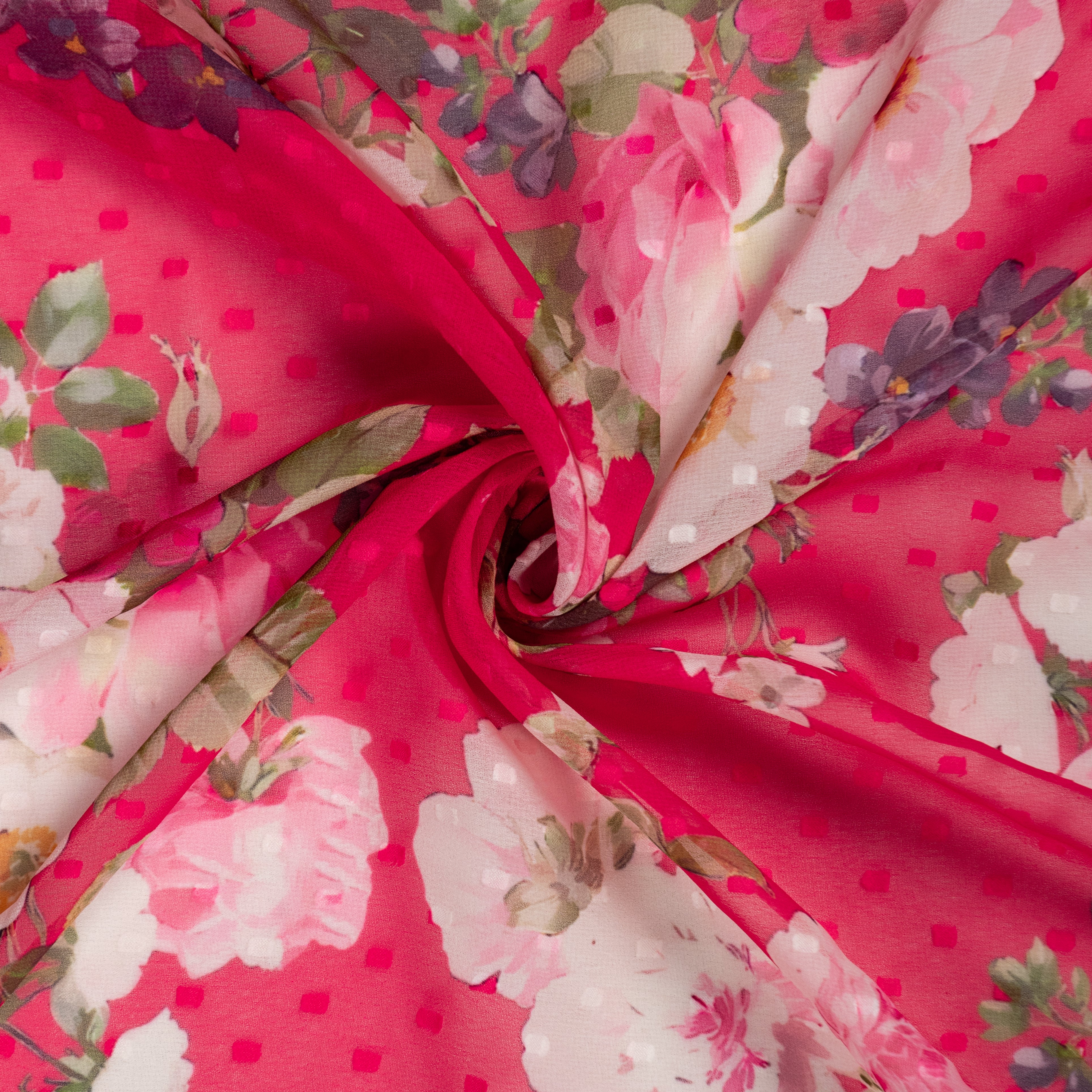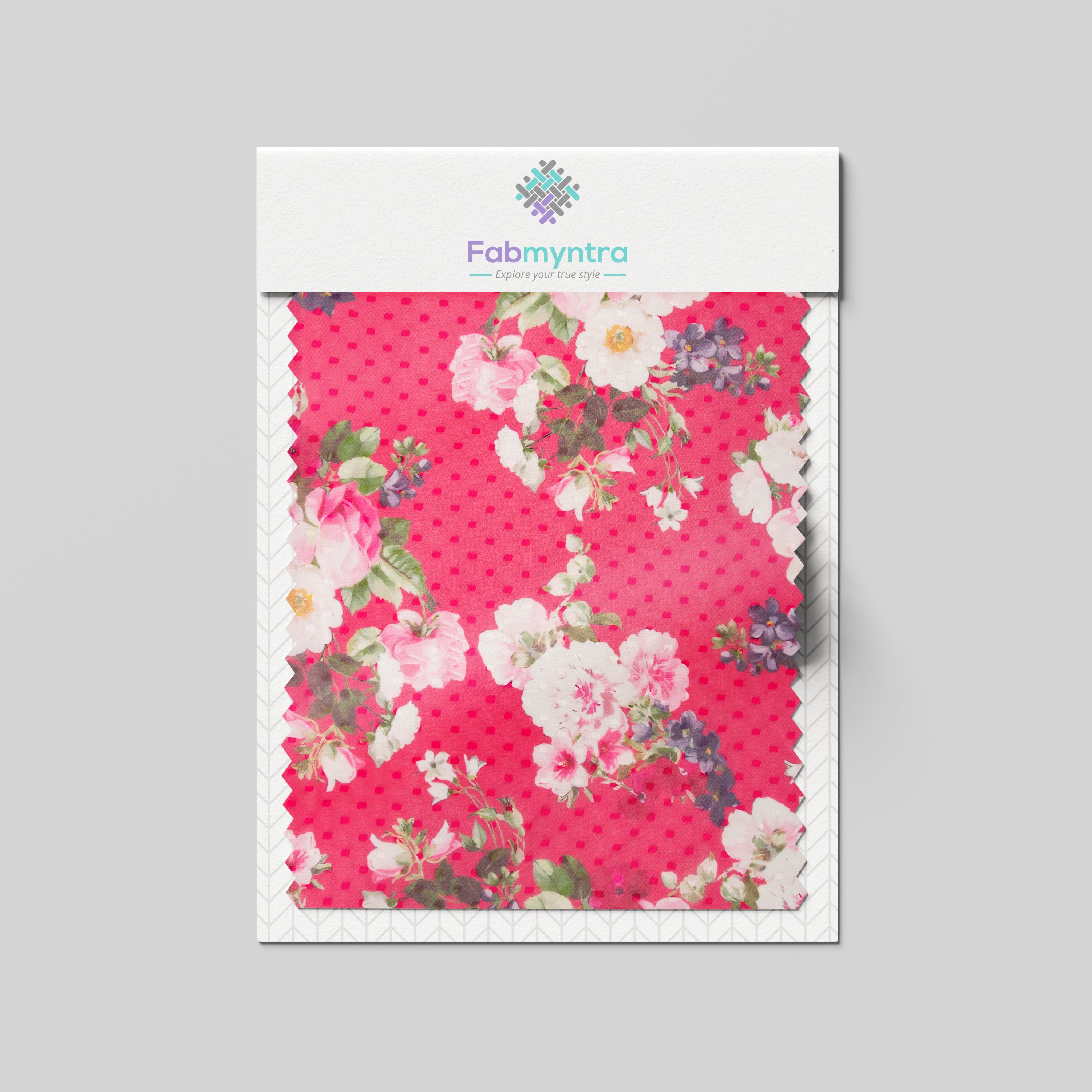 Georgette Dobby fabric is a type of polyester fabric that has a distinctive dobby weave, giving it a textured appearance. It is often printed with digital designs, which provides sharp and vibrant prints. This fabric is lightweight, durable, and easy to care for, making it a popular choice for clothing and home decor items. It has a slightly sheer appearance, drapes well, and has a soft, flowing feel.