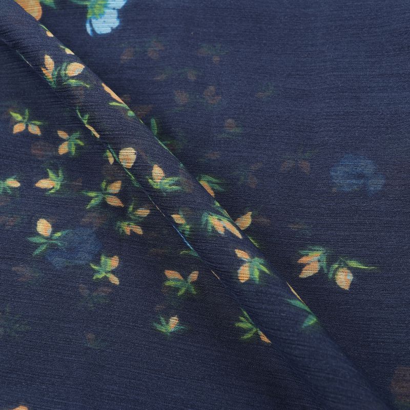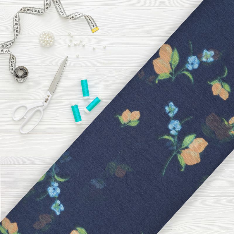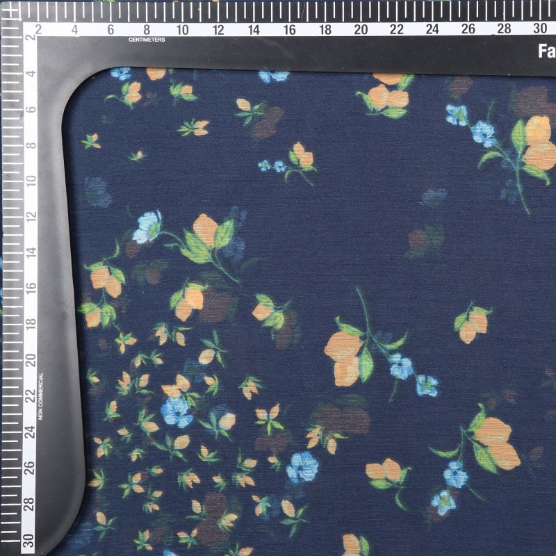 Navy Blue And Yellow Floral Pattern Screen Print Chiffon Fabric