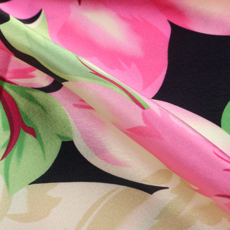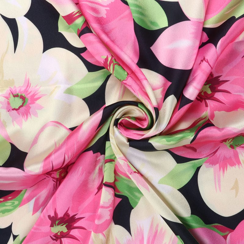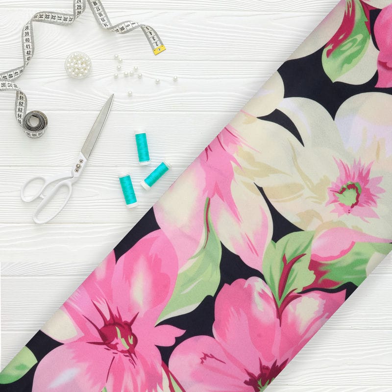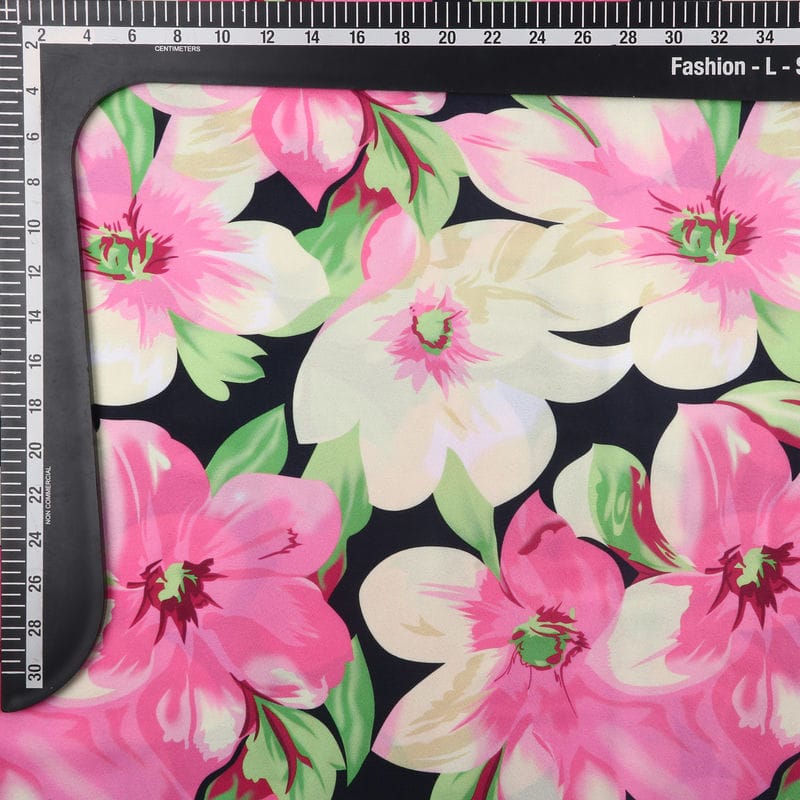 Pink And Black Floral Pattern Digital Print Japan Satin Fabric