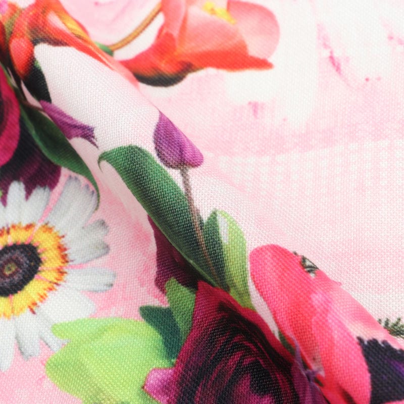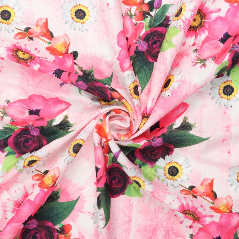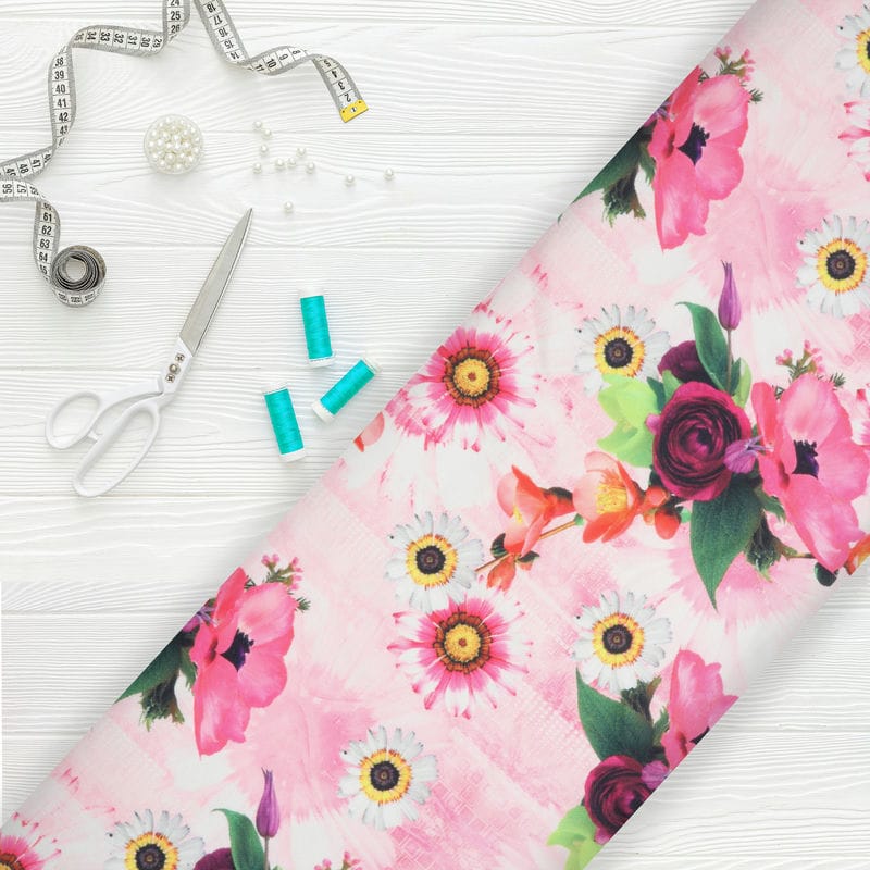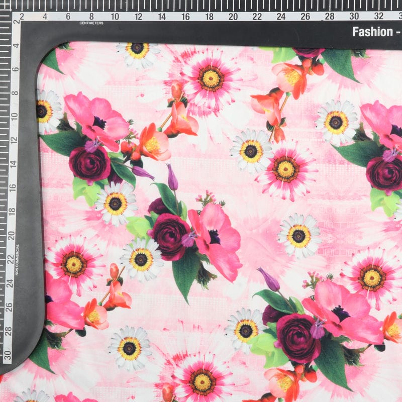 Pink And White Floral Pattern Digital Print Rayon Fabric