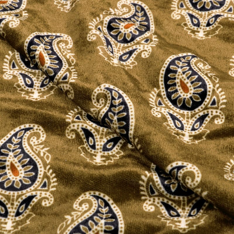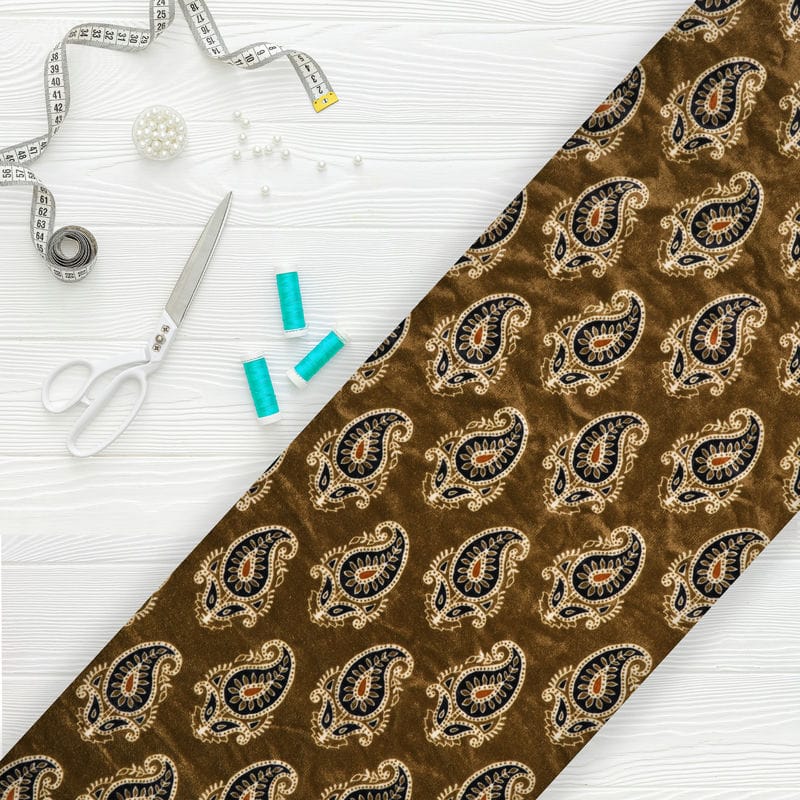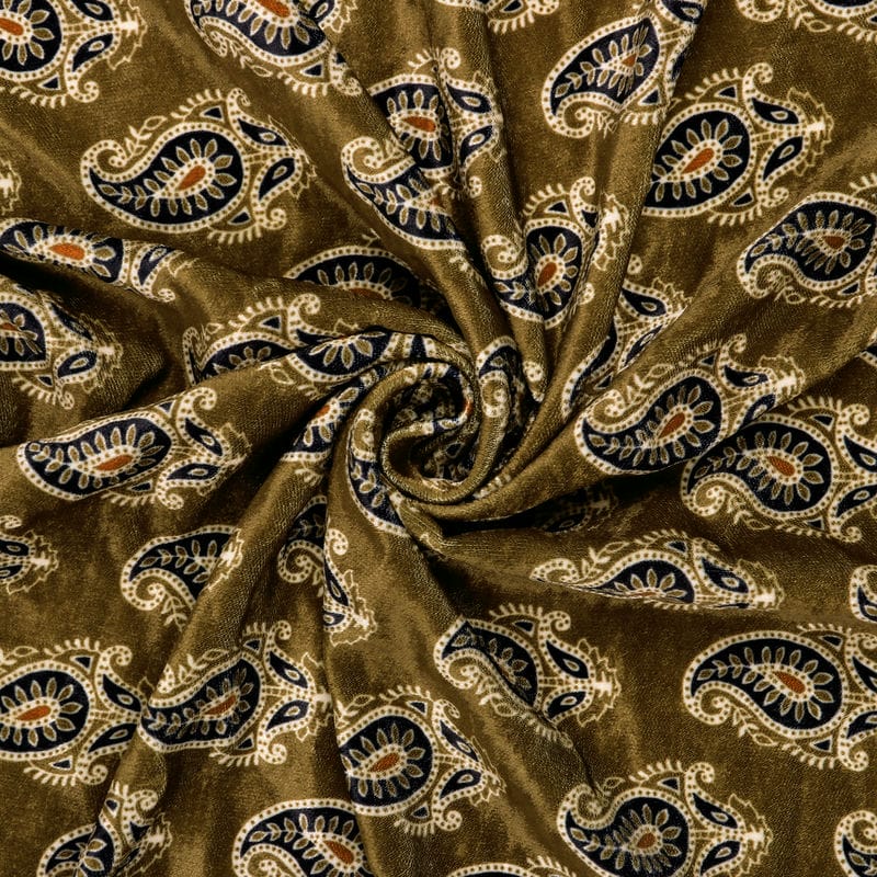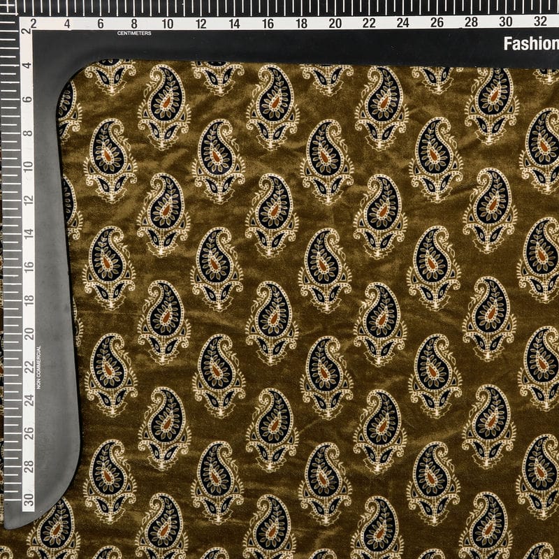 Dark Olive And Navy Blue Paisley Pattern Digital Print Velvet Fabric