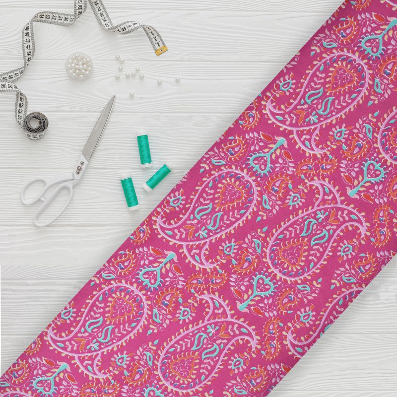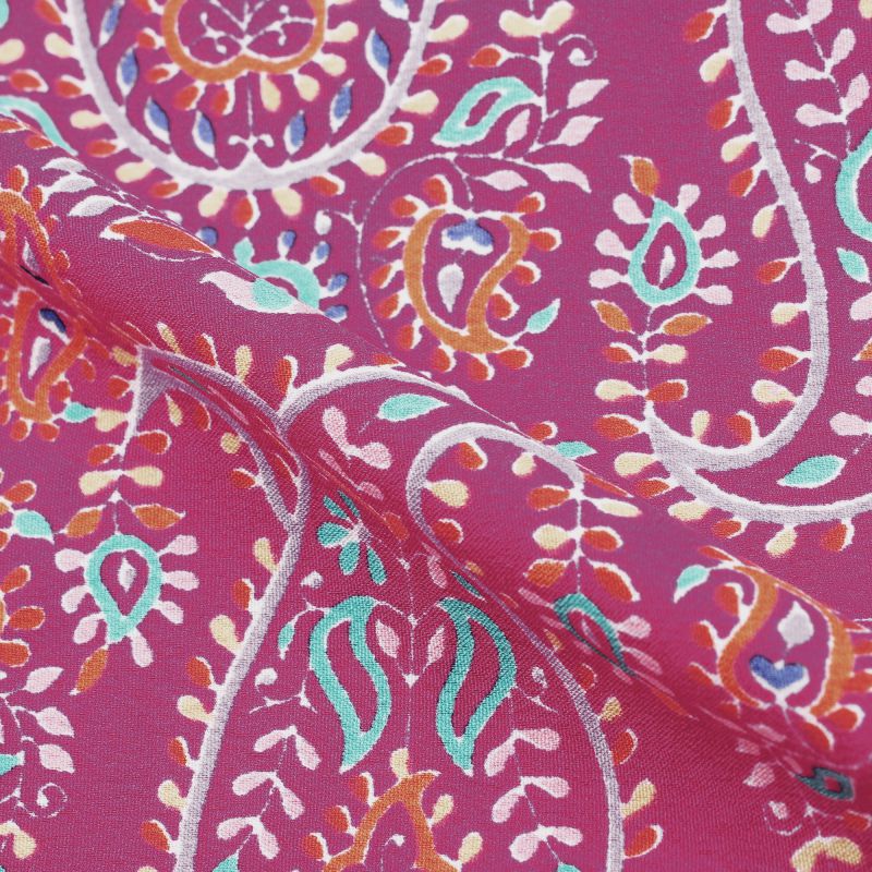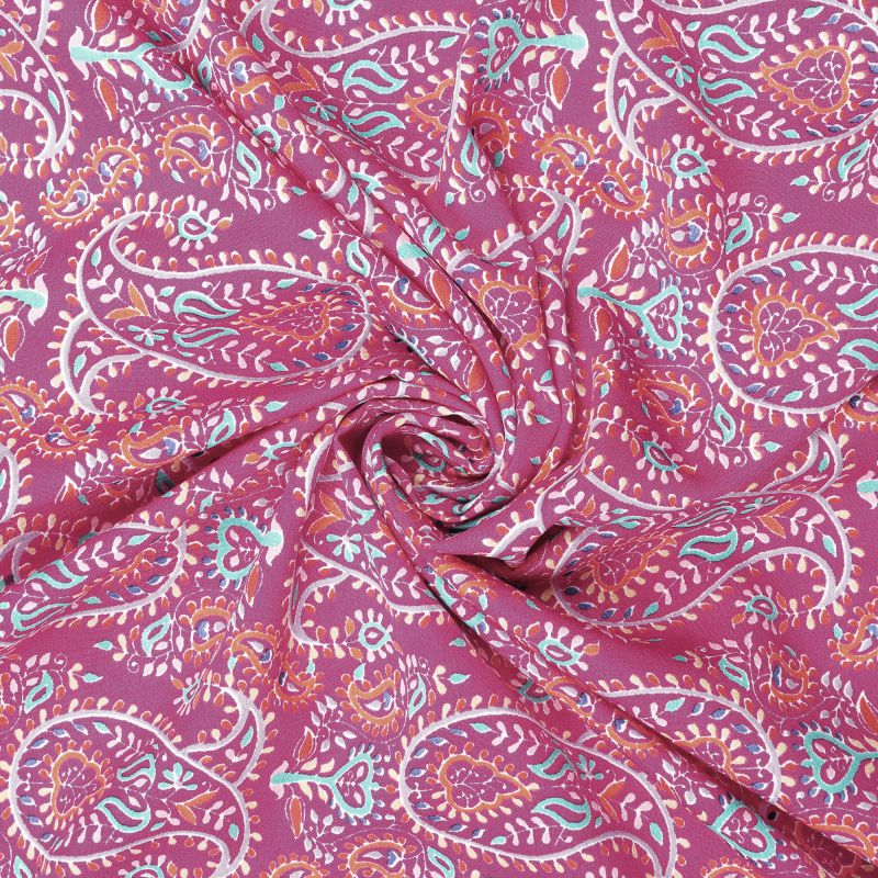 Dark Pink And Blue Paisley Pattern Screen Print Ameircan Crepe Fabric