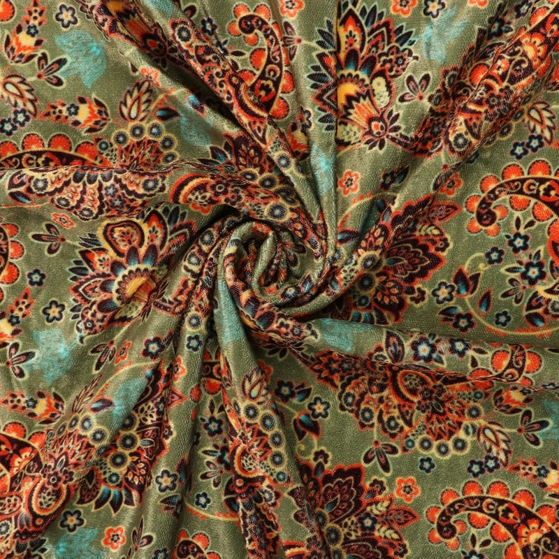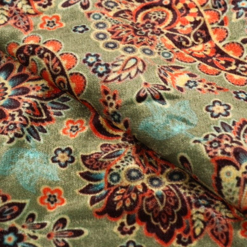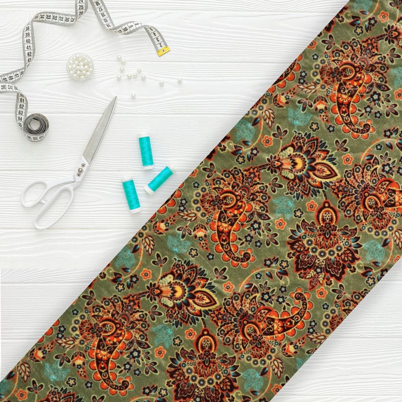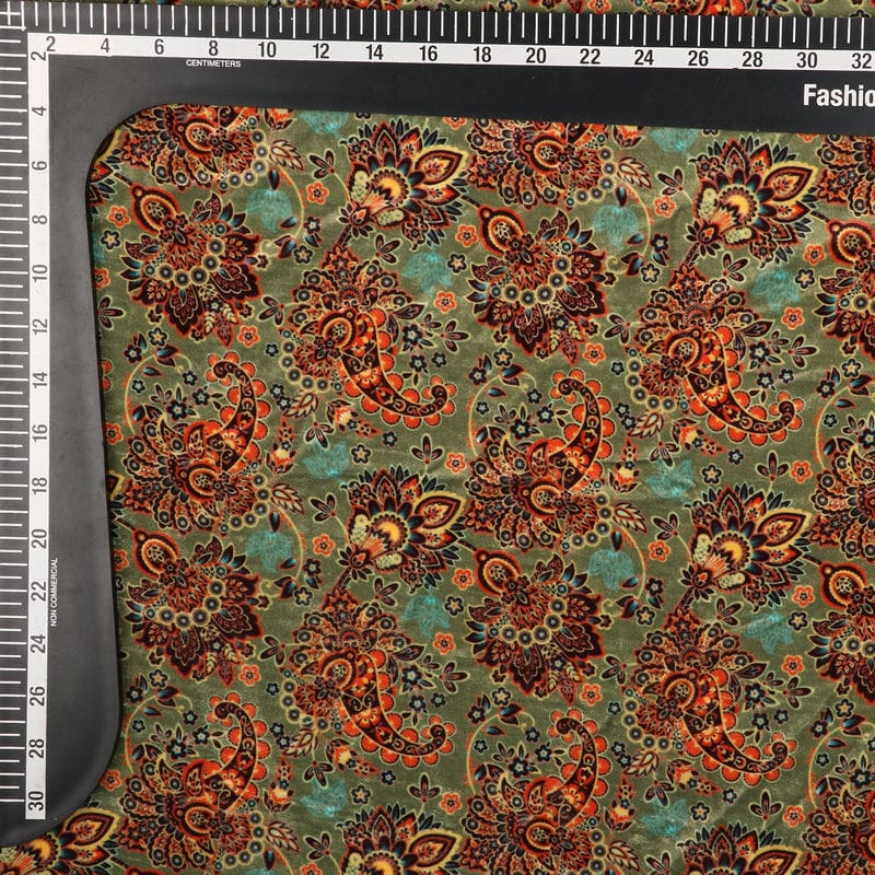 Olive Green And Carrot Orange Paisley Pattern Digital Print Velvet Fabric